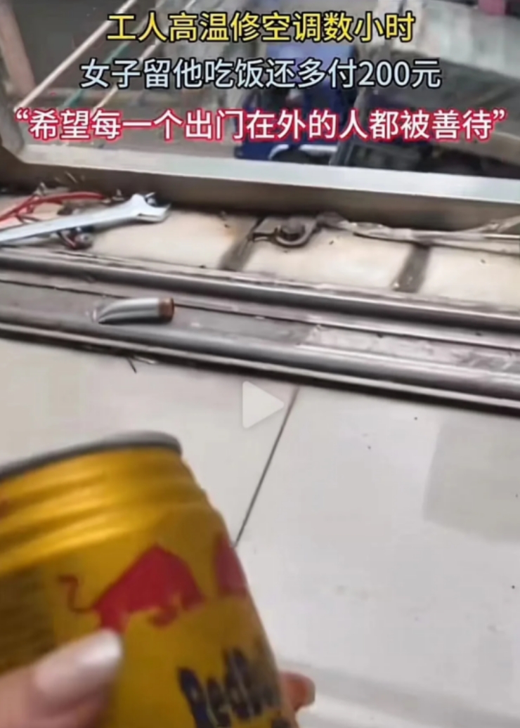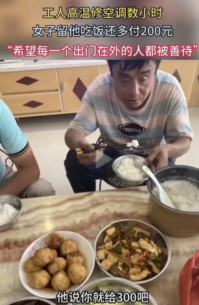 实在让人感动!广东一女子家中的空调坏了,由于天气实在炎热,叫维修师傅修空调,师傅在烈日洋洋下从早上8点修到中午的11点,女子觉得师傅在这样的高温下给自己修空调,实在是不容易,于是在师傅干完后,邀请师傅留在家中吃午饭。 师傅面对女子的盛情邀请,主动提出让女子少给一些钱,说给300块钱就行,但是女子的做法让人十分感动! (信源:澎湃新闻2023年7月5日工人高温天修空调,女子留其吃饭还多给了200元安装费) 广东的夏天依旧是非常的炎热,在这样的天气下人们最需要的就是空调,让空调给自己带来凉爽,缓解天气带来的烦闷。晚上躺在床上睡觉,如果没有空调,人们都难以入眠。 王女士正在睡觉的时候,突然被热醒,起初她还以为自己家里面停电了,所以她先尝试将灯打开验证一下家里到底是不是停电了,可是灯一开就亮了起来,这也证明了家里没停电,是空调坏了。 面对蒸笼一样的房间,她感到非常的无奈,这样肯定是没有办法睡着的,她只能去将尘封已久的电风扇给拿出来,但是风扇并不能缓解这个房间的燥热,王女士身上还是止不住的出汗,她也只能这样度过了难熬的夜晚。 一晚上,她心里面都在盼望着天亮,然后找维修师傅将空调整好,这天气实在是离不开空调。她一早就赶紧联系维修师傅来修理一下空调。维修师傅在接到王女士的电话,就赶忙赶过来。 王女士看到维修师傅就好像看到了希望,赶紧让维修师傅进屋,然后跟他将自己家空调的情况告知师傅。师傅在了解情况之后就赶忙对王女士家的空调的进行了检查,然后发现是空调的外机出现了故障。 外机扣在外面的墙壁上,这也意味着维修师傅需要爬到外面,王女士感觉十分的不安全,只能提醒师傅小心点,只见他做好措施之后,竟然直接从窗户过去,这可把王女士吓到了。 维修师傅看见王女士的反应,赶紧说道:“没事的,我干这个已经很久了,没有什么大问题。但是王女士还是紧绷着神经,生怕维修师傅出现什么危险。 王女士感觉维修师傅在这样的高温下,做这么危险的工作实在是非常的辛苦,从早上8点修到了中午11点,师傅的衣服已经浸湿了,修好之后就进屋里面,对空调进行调试,然后空调就开始出凉风的。 她为了表示对维修师傅的感谢,邀请了维修师傅中午留在家里面吃饭,他感到非常的不好意思,说道只要给自己维修费300元就行,但是王女士还是再次邀请他留在家里吃饭。 最终师傅在王女士家里吃了中午饭,并且在给他维修费的时候,竟然多给了师傅200元,师傅还以为她拿多了,赶忙提醒王女士,但是王女士却说这钱就是专门给你的。 王女士她觉得维修师傅非常的辛苦,应该受到大家的善待。她这个举动只是希望外出工作的人都可以受到别人的尊敬,都被人善待,因为自己以前就遭受过不公的对待,所以希望别人能够得到善待。 对此,大家有怎样的看法?