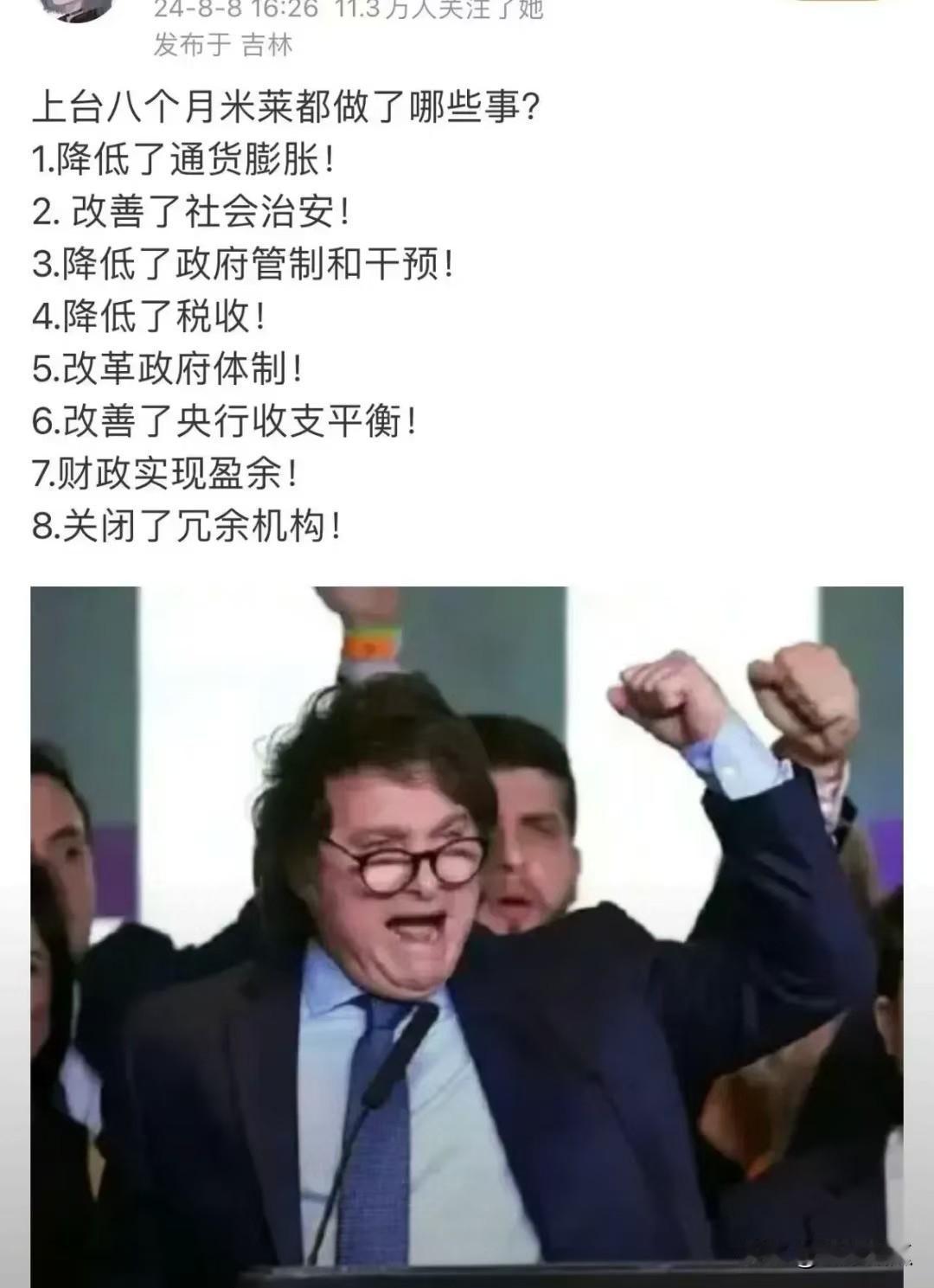 看到有些评价阿根廷米莱执政的政绩,我突然好笑了。试看看这几点, 1.大肆出售国有矿山资产,阿根廷人从未如此积极的游行示威,少说也有几百万 2.放开牛肉出口管制,阿根廷人因为国内牛肉价格上涨,增加猪肉消费,牛肉消费量人均下降16% 3.印刷的货币,比之前的2000比索增加5倍,达到了10000比索 4.除了几个亲美国家,与其他南美国家关系几乎全面恶化 5.把20吨黄金运到英国, ... ... 我实在说不下去了,