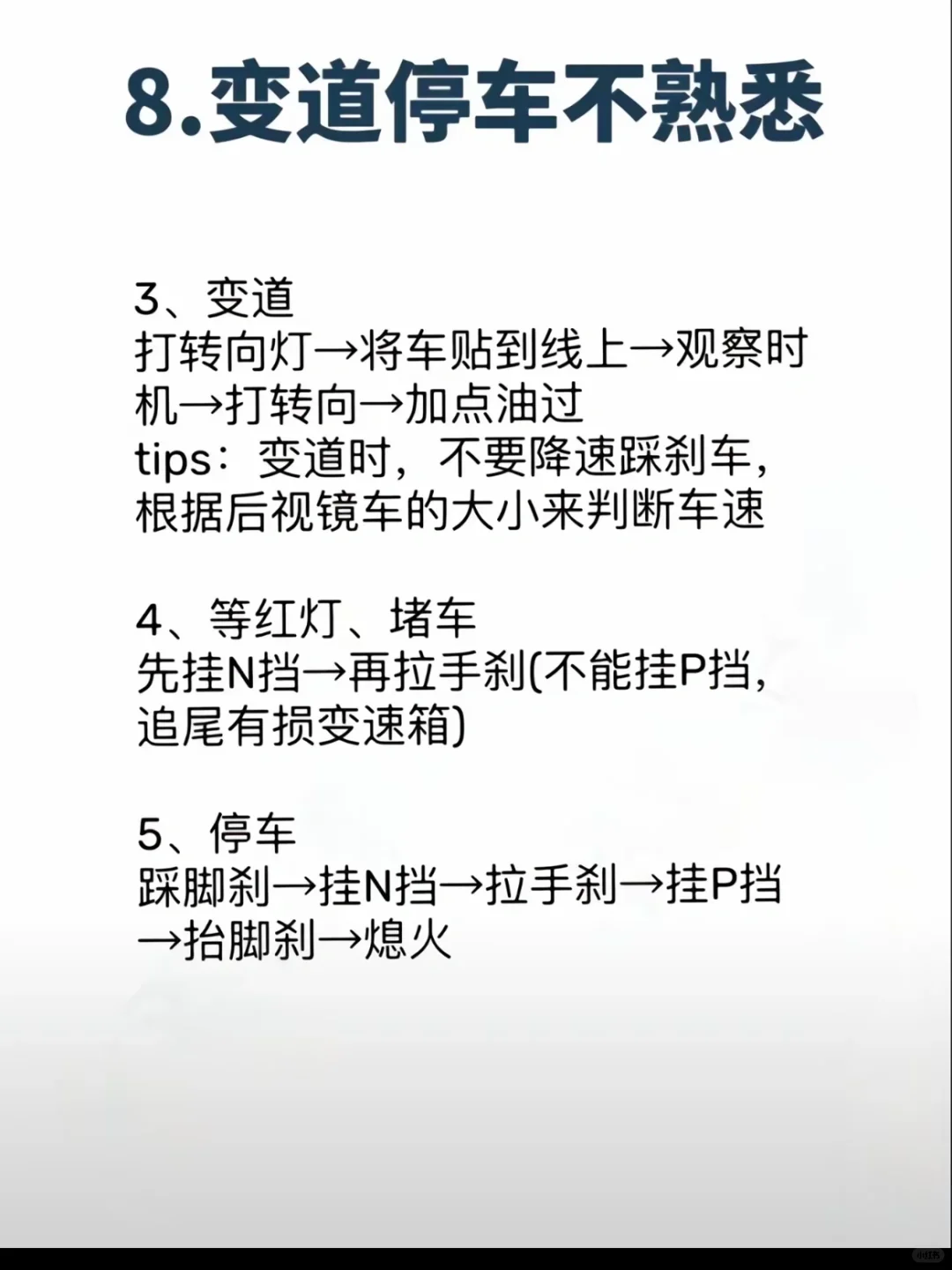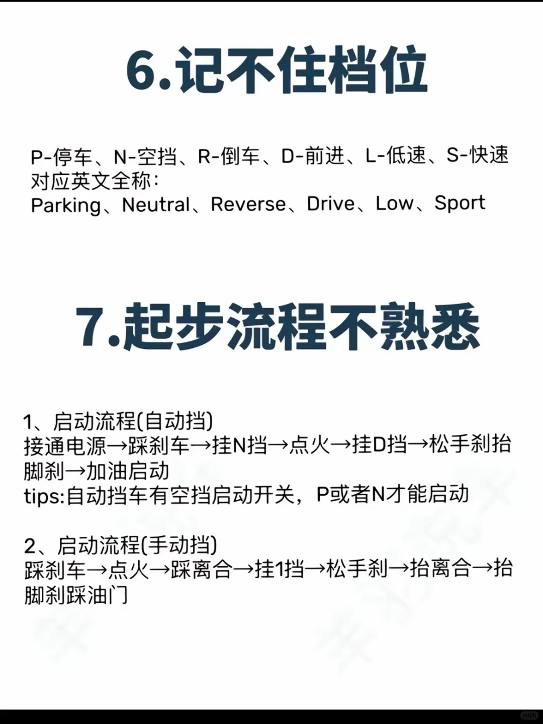 6.记不住档位 P-停车、N-空挡、R-倒车、D-前进、L-低速、S-快速对应英文全称: Parking, Neutral, Reverse, Drive, Low, Sport 7.起步流程不熟悉 1、启动流程(自动挡) 接通电源一踩刹车一挂N挡一点火一挂D挡一松手刹抬脚刹一加油启动 tips:自动挡车有空挡启动开关,P或者N才能启动 2、启动流程(手动挡) 踩刹车一点火一踩离合一挂1挡一松手刹一抬离合一抬脚刹踩油门