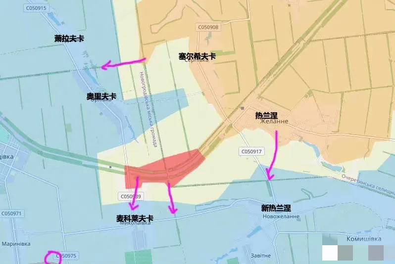 红军村方向今天的最新态势,俄军在占领了热兰涅之后,继续加速推进,目前已逼近了奥里夫卡和茹拉夫卡 。
