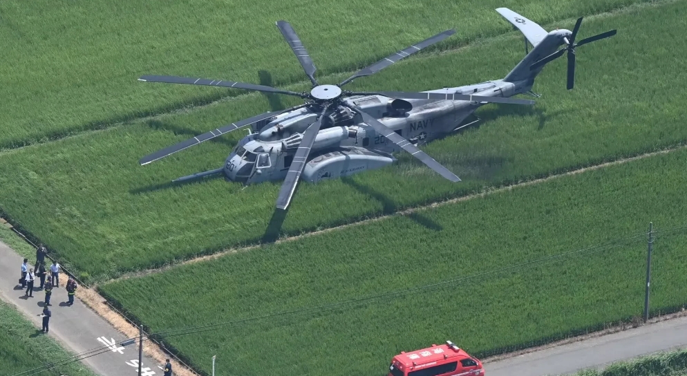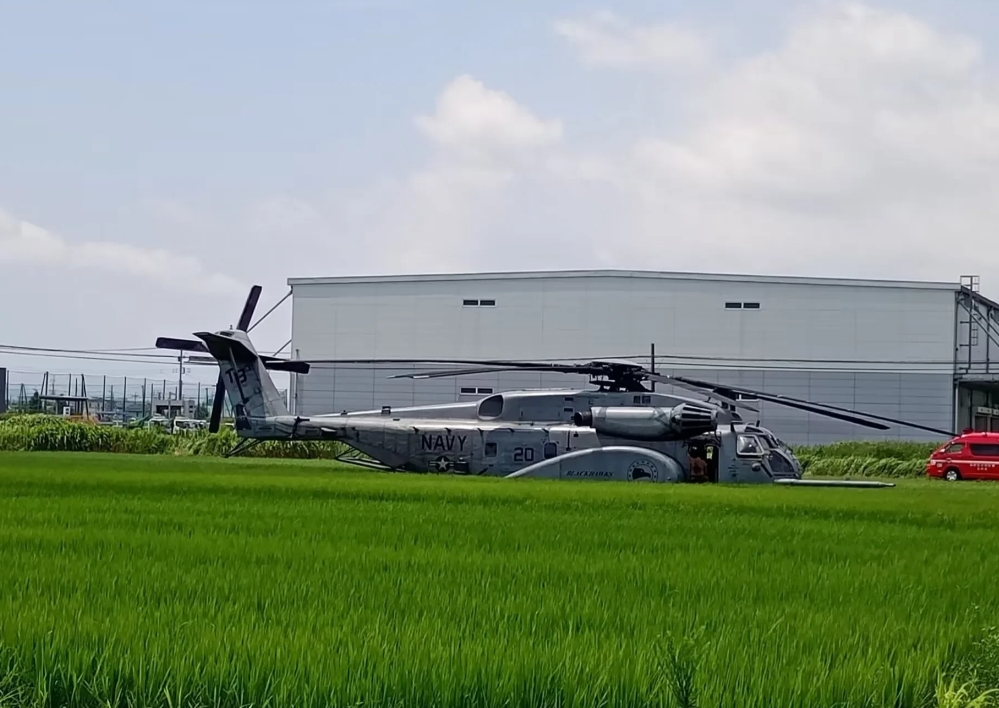驻日美军的一架CH53直升机在农田降落,从现场的照片来看,这架大型直升机似乎没有