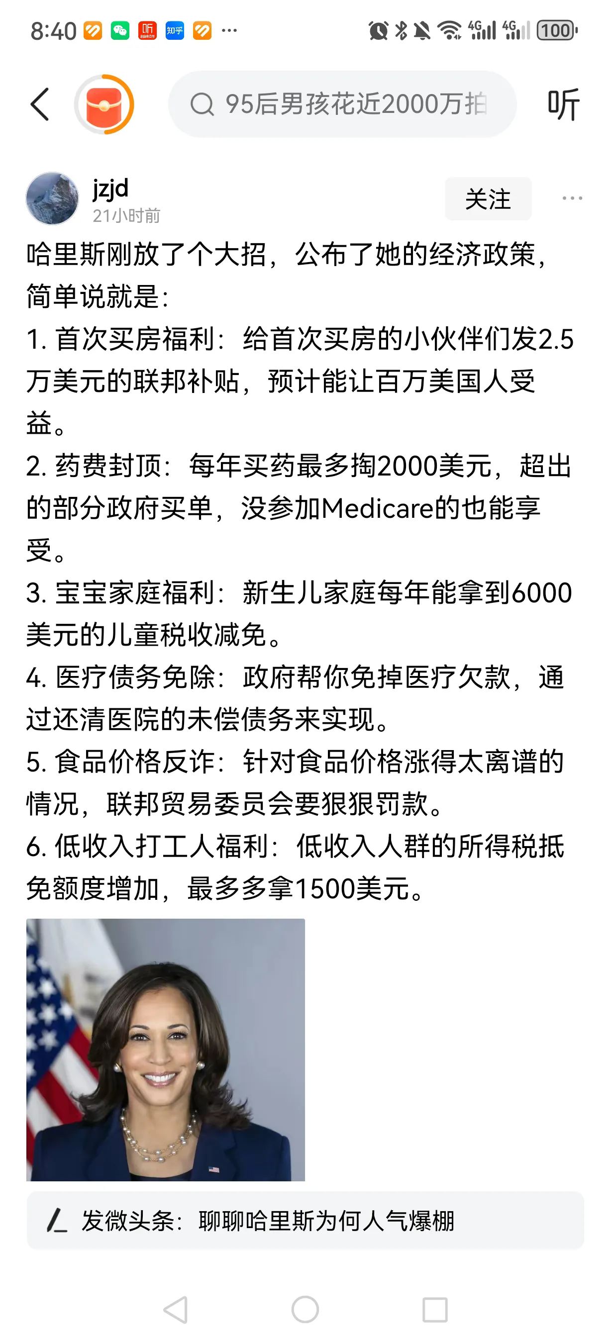 比如,年轻人首次买房,可以获得政府2.5万美元补贴,后面还有生育免税其实还是政府补贴,药费、食品、医疗,以及对低收入人群都有不同程度的政府不同形式的补贴。这政策好不了呢,当然好。看到评论区有小伙伴说,“谁给我2万5我选谁”,说好听点叫新的经济政策,说不好听点儿,这不就是集体向选民行贿么?她说的是补贴么,她要的是选票。