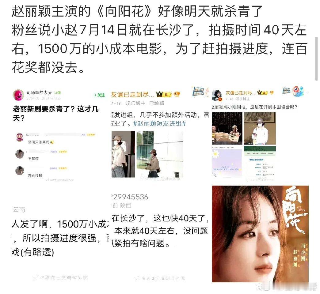 #赵丽颖向阳花杀青了# 冯小刚执导赵丽颖主演的电影《向阳花》已经杀青了!从七月中旬开始拍,拍摄40天左右,这是正常的拍摄周期吧,还有比这还短的呢。