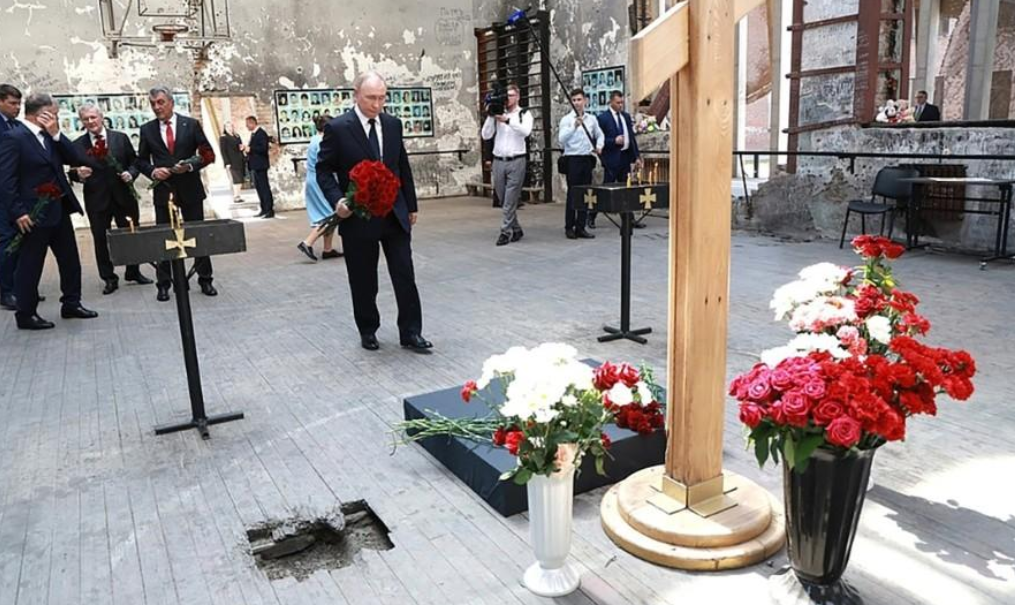 别斯兰恐袭纪念碑前,普京跪地献花,誓言消灭突袭库尔斯克的乌军