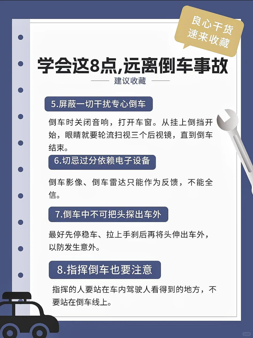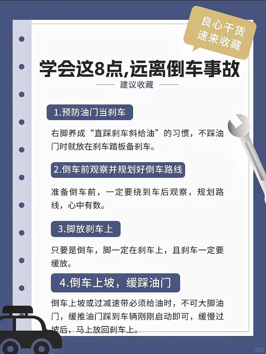 学会这8点,远离倒车事故 建议收藏 1.预防油门当刹车 右脚养成“直踩刹车斜给油”的习惯,不踩油门时就放在刹车踏板备刹车。 2.倒车前观察并规划好倒车路线 准备倒车前,一定要绕到车后观察,规划路线,心中有数。 3. 脚放刹车上 只要是倒车,脚一定在刹车上,且刹车一定要缓放。 4.倒车上坡,缓踩油门 倒车上坡或过减速带必须给油时,不可大脚油门,缓推油门踩到车辆刚刚启动即可,缓慢过坡后,马上放回刹车上。