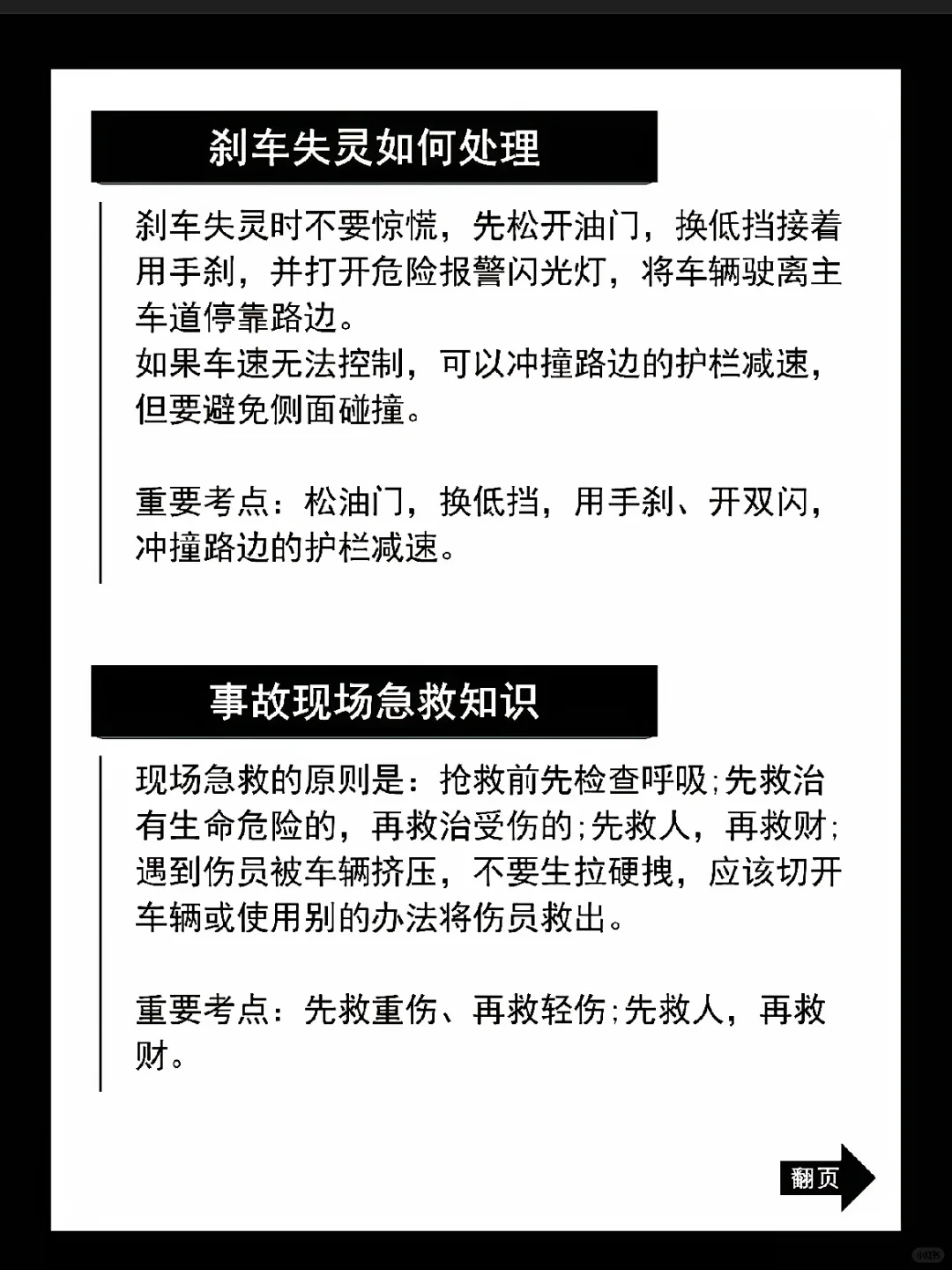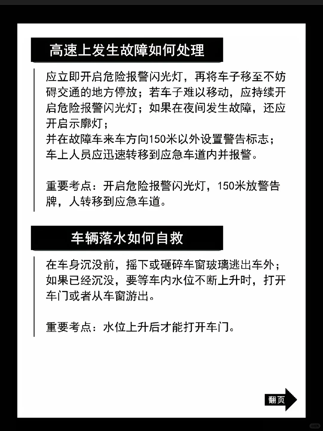 高速上发生故障如何处理 应立即开启危险报警闪光灯,再将车子移至不妨碍交通的地方停放;若车子难以移动,应持续开启危险报警闪光灯;如果在夜间发生故障,还应开启示廓灯; 并在故障车来车方向150米以外设置警告标志; 车上人员应迅速转移到应急车道内并报警。 重要考点:开启危险报警闪光灯,150米放警告牌,人转移到应急车道。 车辆落水如何自救 在车身沉没前,摇下或砸碎车窗玻璃逃出车外; 如果已经沉没,要等车内水位不断上升时,打开车门或者从车窗游出。 重要考点:水位上升后才能打开车门。