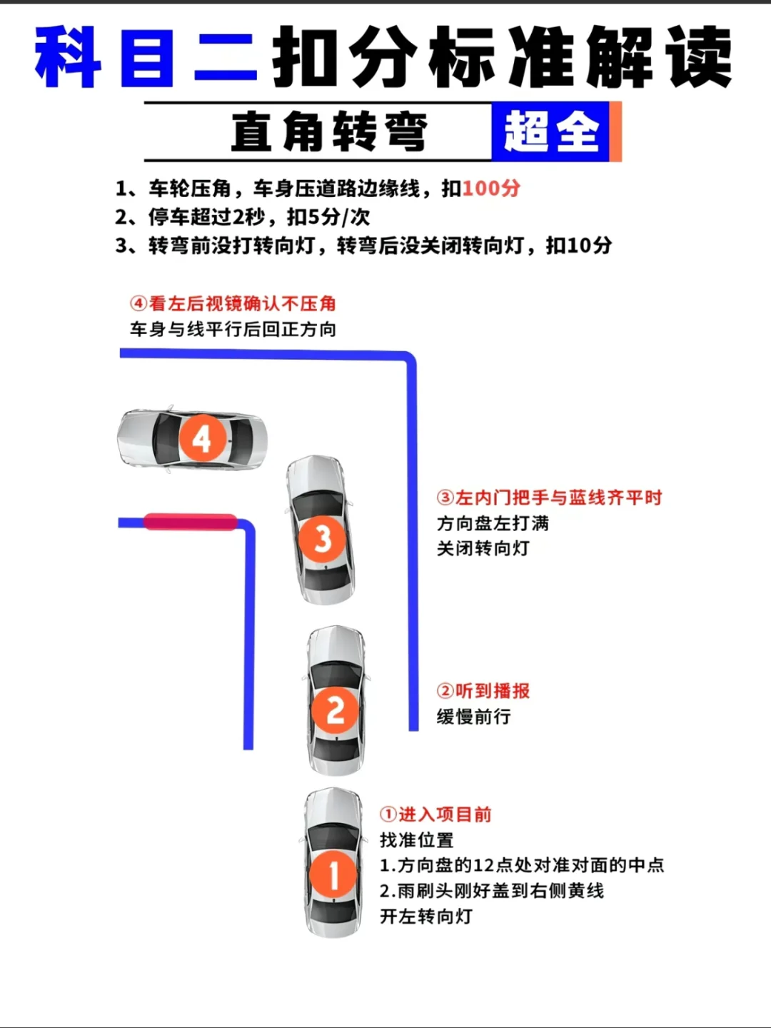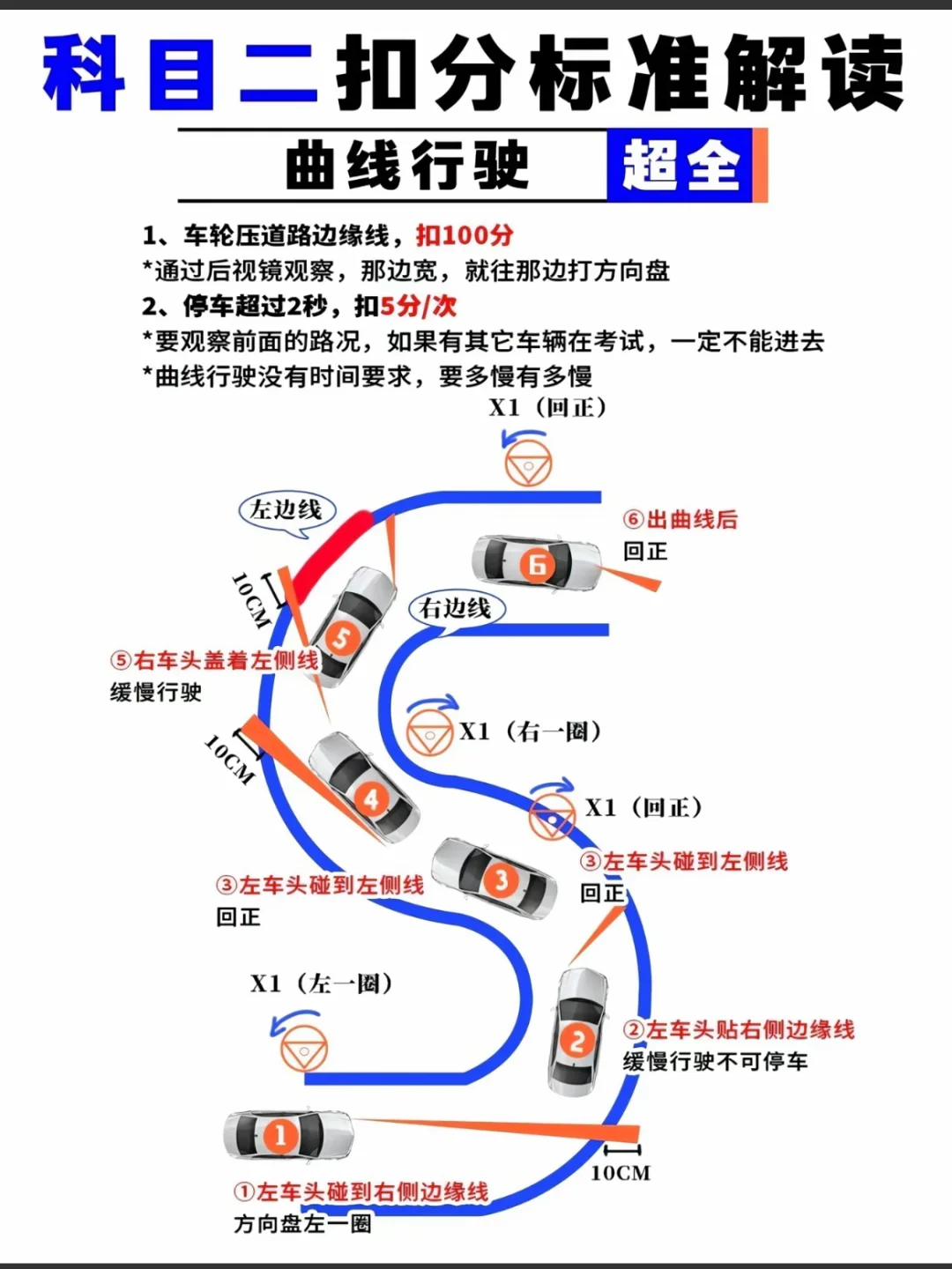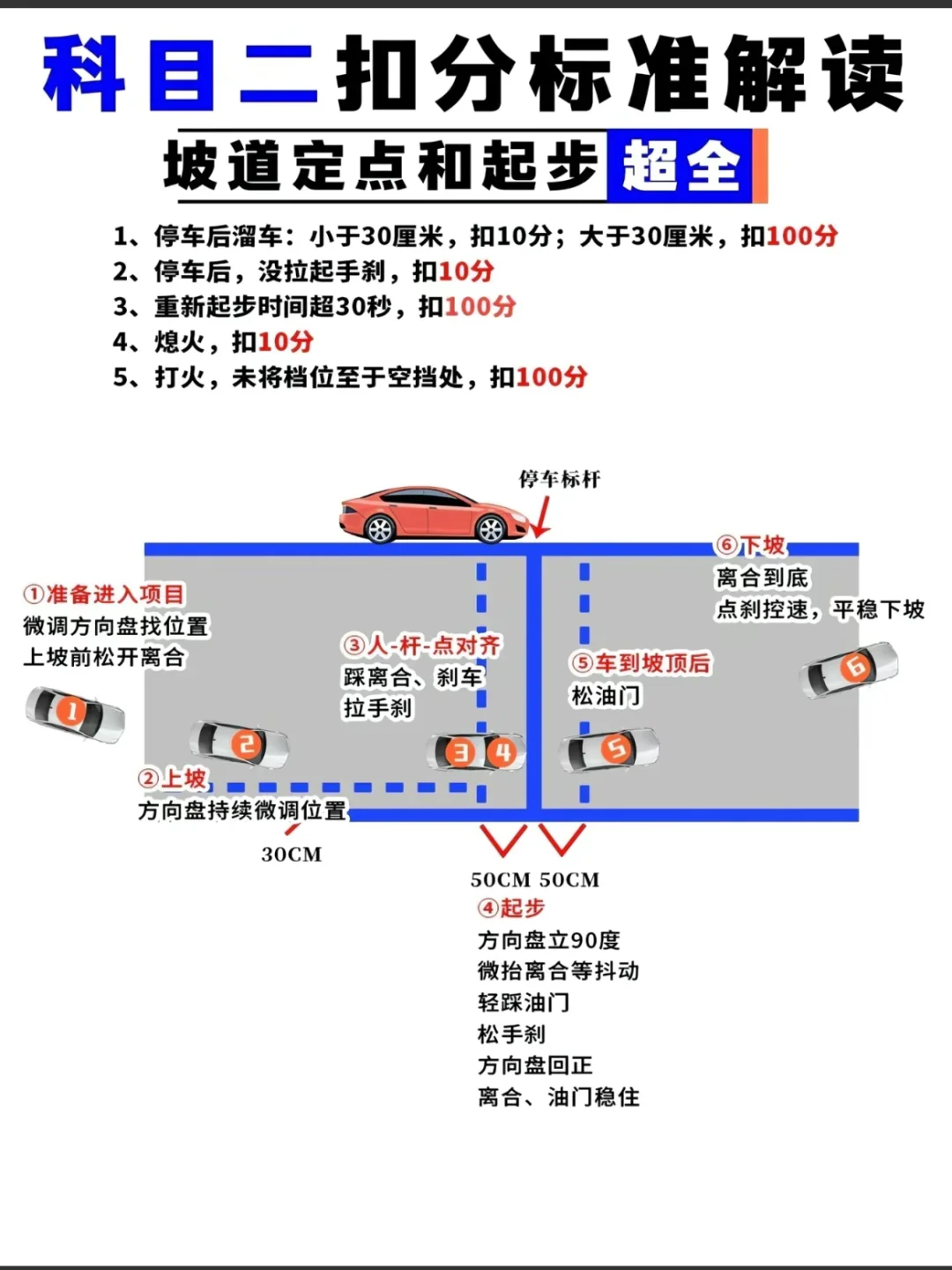 2、中途不能停车,中途停车超2秒:扣5分/次