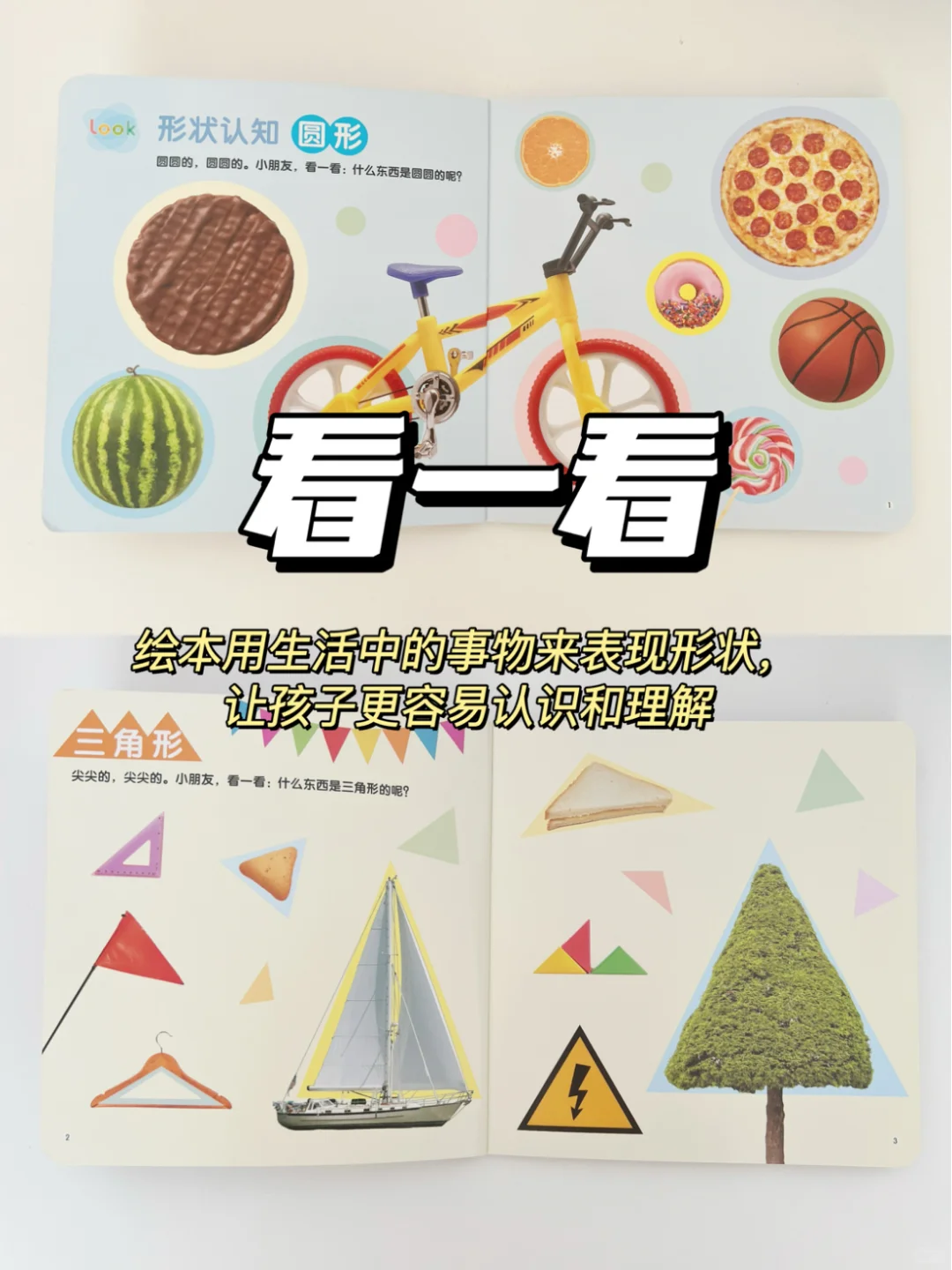 首先陪宝宝阅读绘本《圆形 三角形 方形》,绘本用生活中常见的事物来表现出圆形、方形和三角形,让他更容易认识和理解形状。