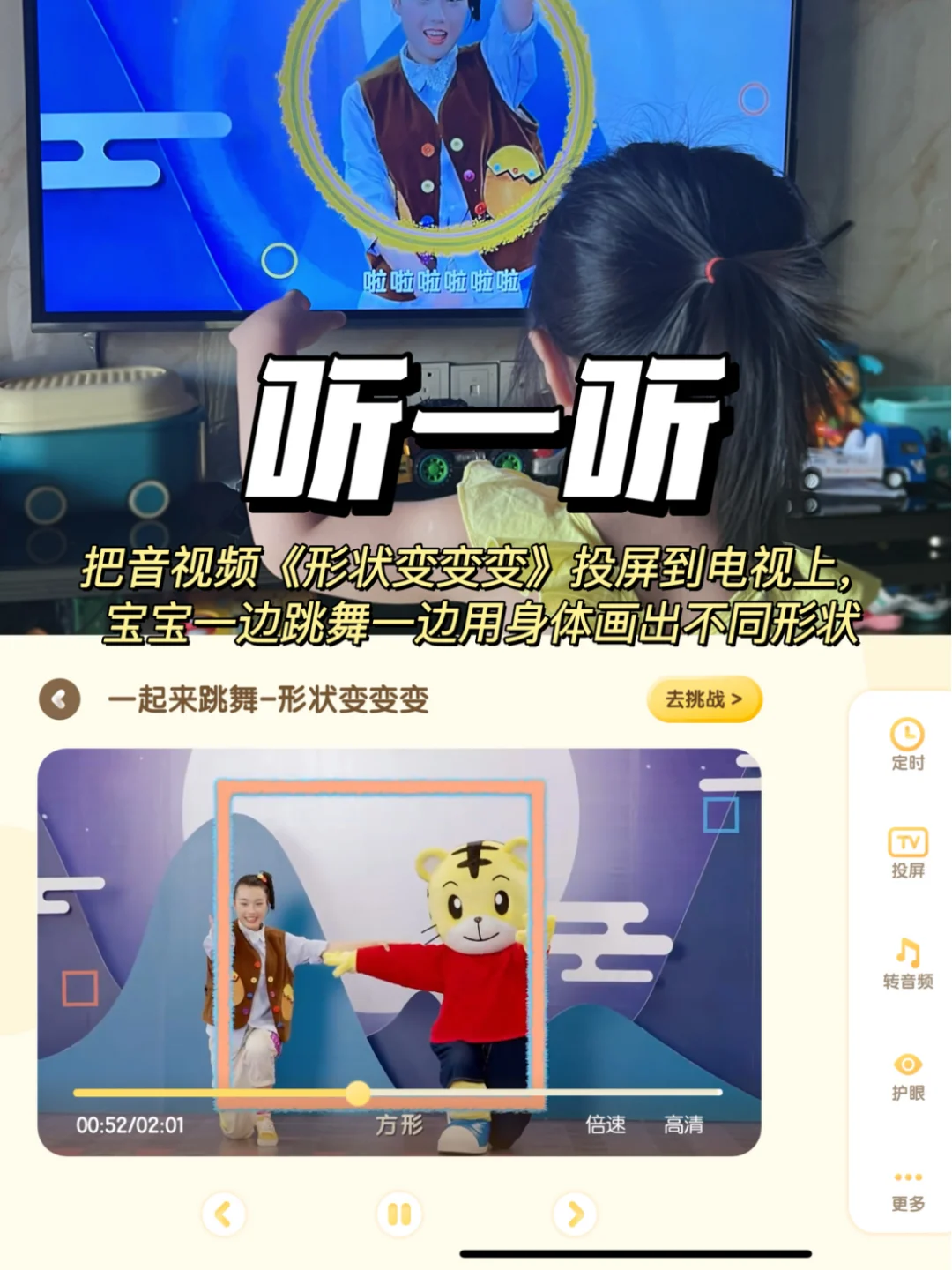 我还会把APP上的音视频《形状变变变》投屏到电视上,宝宝跟着巧虎,一边跳舞一边用身体画出不同的形状,巩固前面所学。