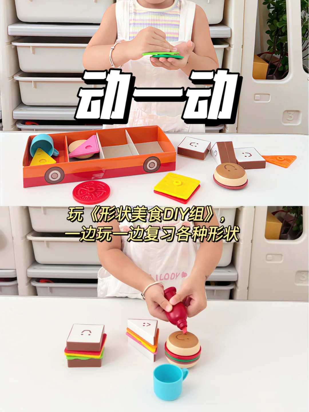 套装里还有配套玩具《形状美食DIY组》。让宝宝亲自动手,组装各种形状的汉堡,一边玩一边复习各种形状,对形状的理解是越来越熟悉了。