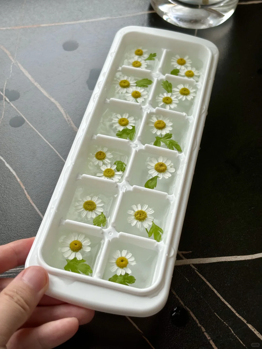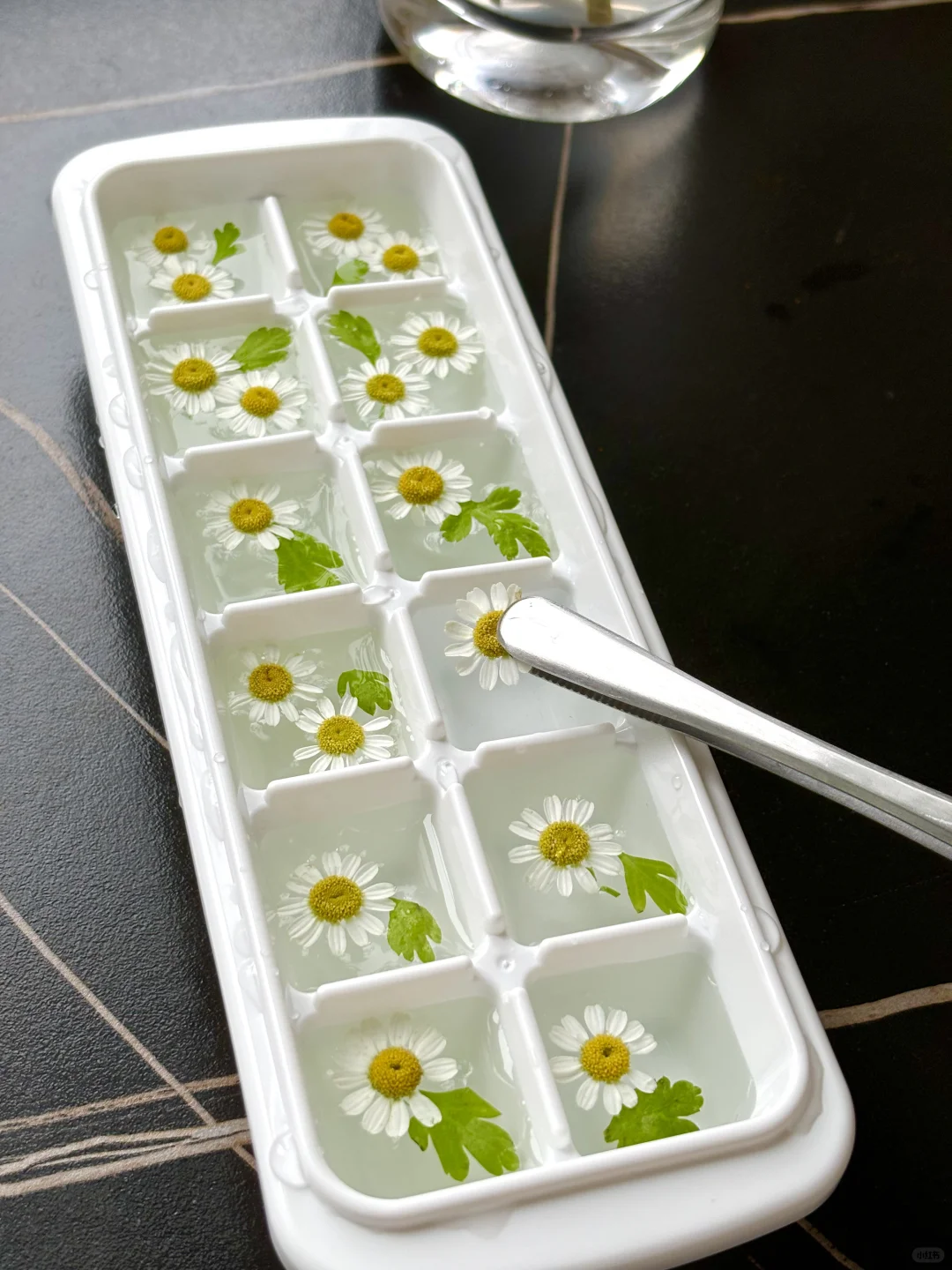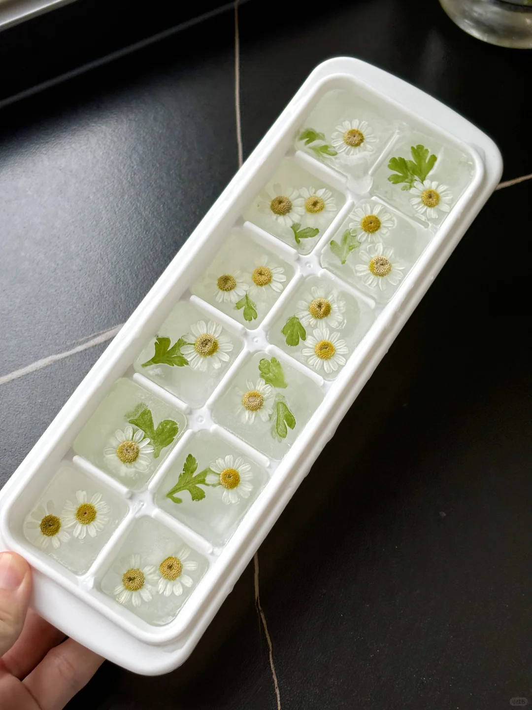 我发现洋甘菊的东西都好文艺小清新呀~~ 冻个冰块都能这么好看! 随便倒点气泡水都颜值满满 这在咖啡馆不得卖爆啊!