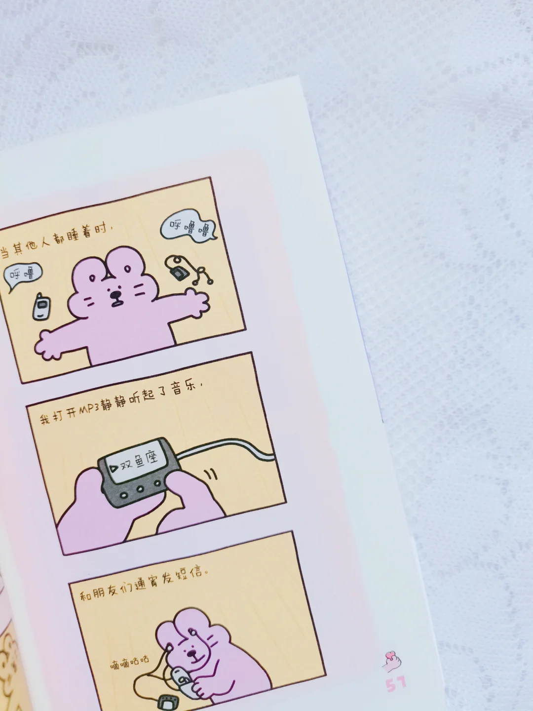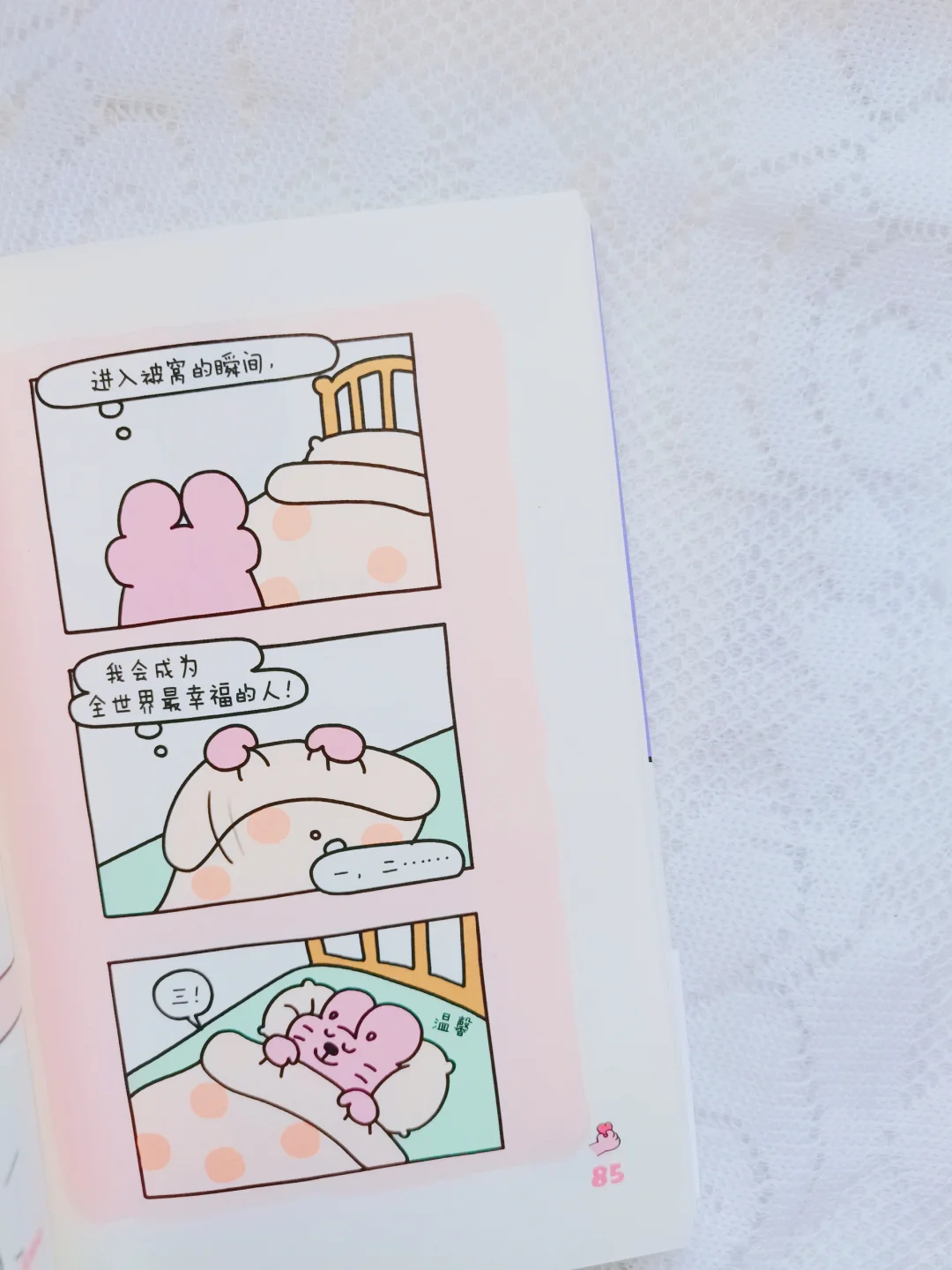 一幅幅兔子小姐和她的小熊先生的日常生活漫画,展现出社畜从疲惫不堪、郁闷、再到释然的过程。可能是一次回忆、可能是一次和朋友说走就走的旅行、还可能是和宠物同处屋檐下却各忙各的陪伴……