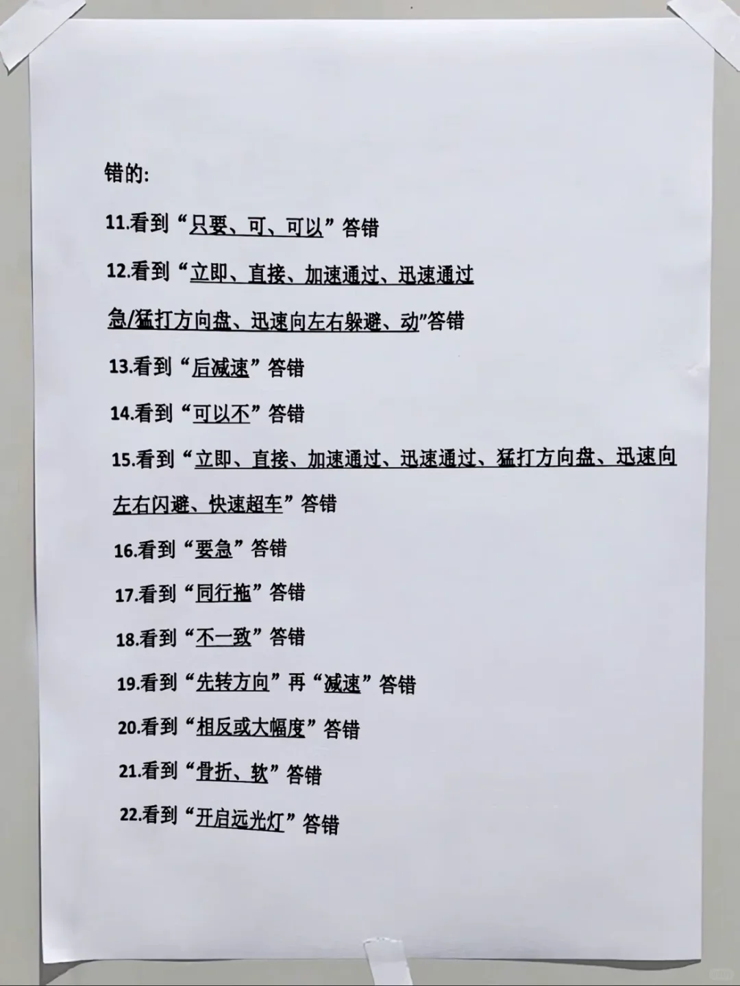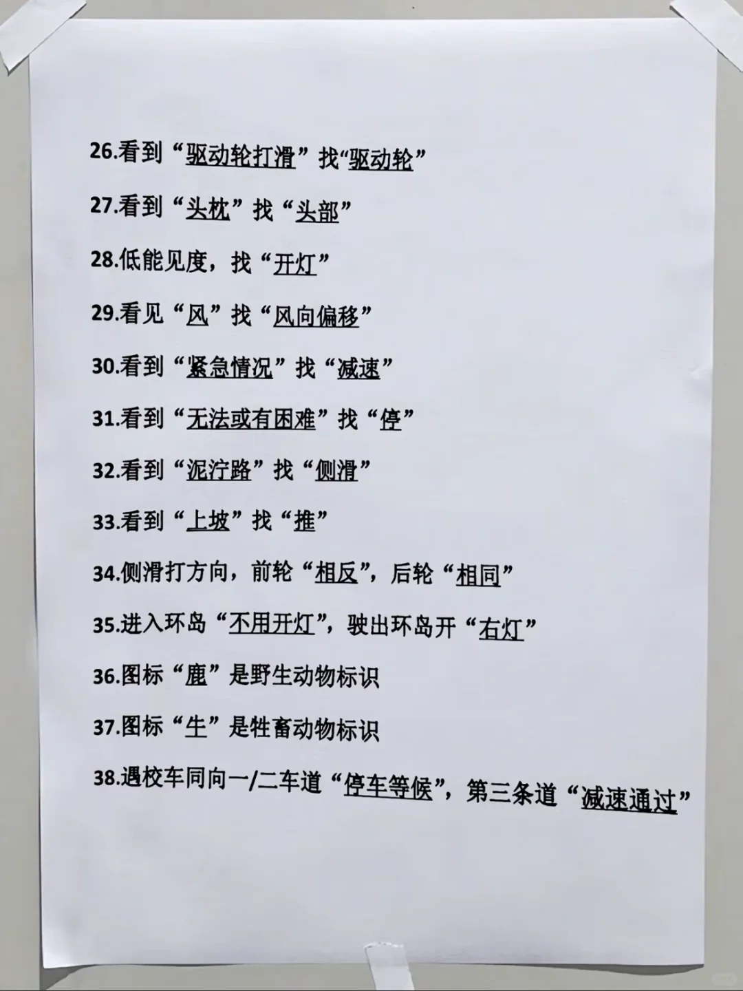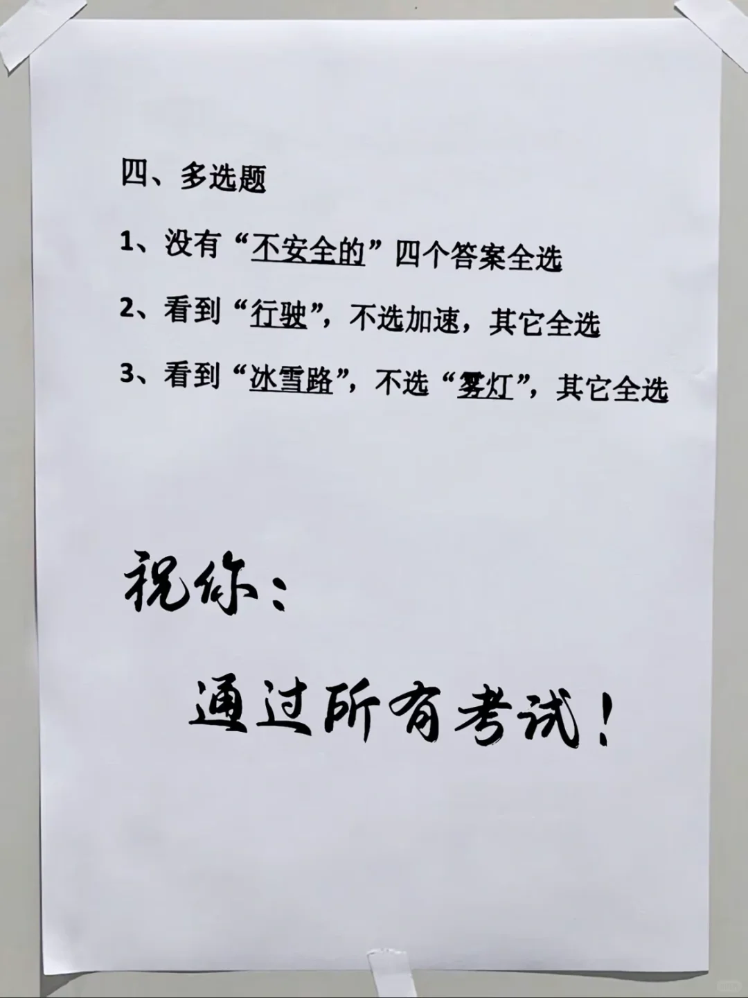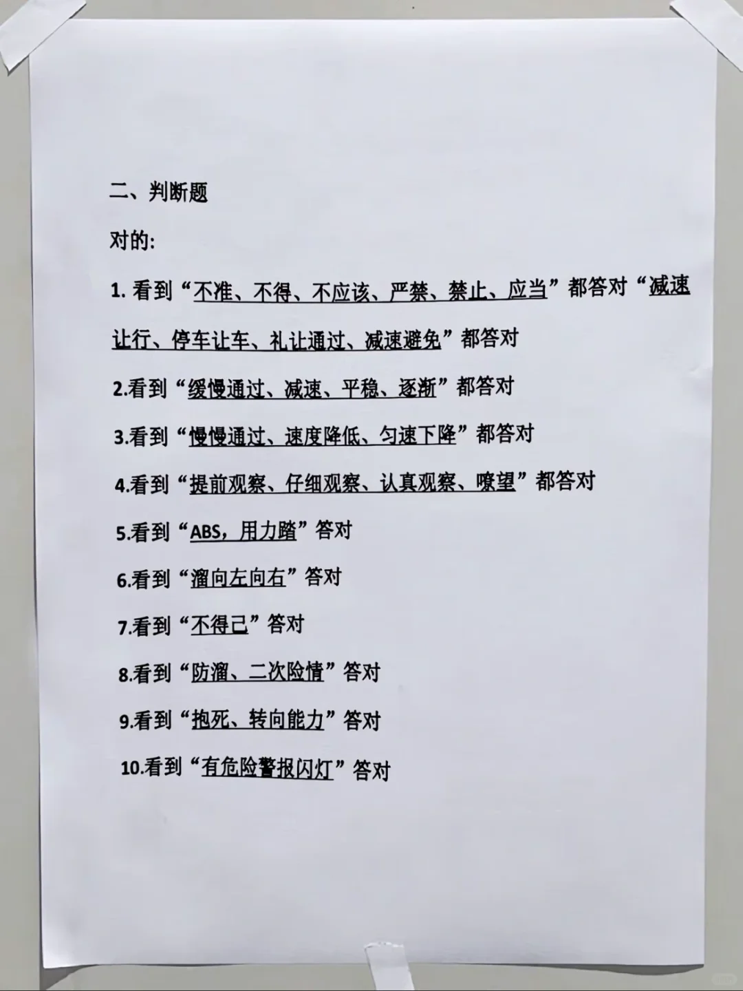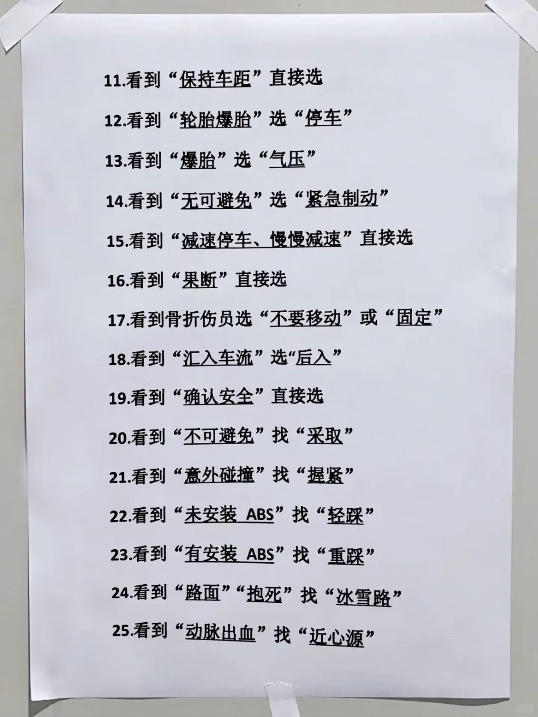 裸考科目四口诀 一、单选题 1.有出血先止血 2.看到 ABS 的作用选保持转向 3.下坡车让上坡车 4.看到临时停车选危险报警闪光灯 5.看到“减速、慢行、停车”直接选对 6.窄桥、窄路、弯路、铁路、冰雪路、泞泥路陡坡、转弯、掉头、速度都选“30公里” 7.看到“挂低速挡”直接选 8.看到“连续制动”选“效果下隆” 9.看到“安全距离”直接选. 10.看到“交替”要选交替,没有“交替”选“近光灯”