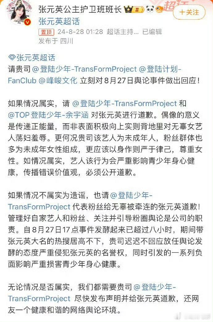 张元英无妄之灾公司赶紧出来回应给张元英道歉#张元英粉丝站要求时代峰峻回应#