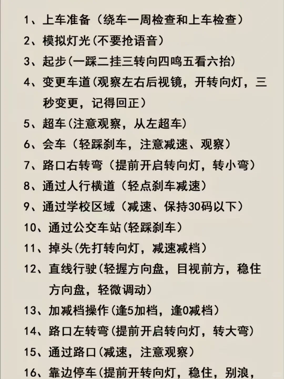 科目三考试内容 1.上车准备 9.通过公交车站 2.灯光模拟 10.路口右转弯 3.起步 11.路口左转 4.直线行驶 12.会车 5.加减档位 13.变更车道 6.通过路口 14.超车 7.通过人行横道 15.掉头 8.通过学校区域 16.靠边停车