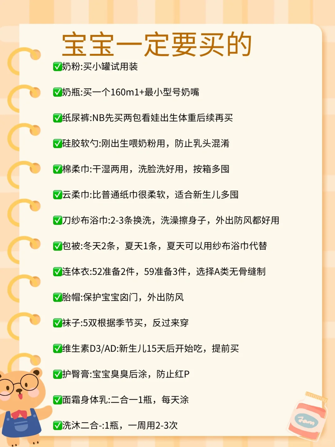 52码连体衣、纱布浴巾、小方巾、NB尿不湿、一次性隔尿垫、洗沐二合一、折叠盆、面霜身体乳、抚触油、护臀膏、云柔巾、棉柔巾、湿巾、宝宝洗衣液、防呛奶瓶、奶粉一段、奶瓶清洗剂、硅胶软勺一把