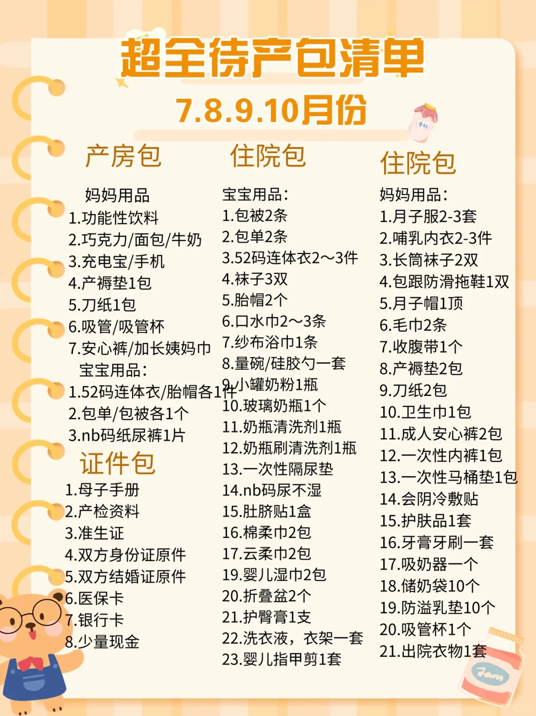 月子服、哺乳内衣、月子长袜、防滑拖鞋、月子帽、产褥垫、安睡裤、一次性内裤、一次性马桶垫、会阴冲洗器、软毛牙刷、牙膏、吸奶器、防溢乳垫、会阴冷敷贴、羊脂膏、吸管杯、蜂蜜露备用、月子帽