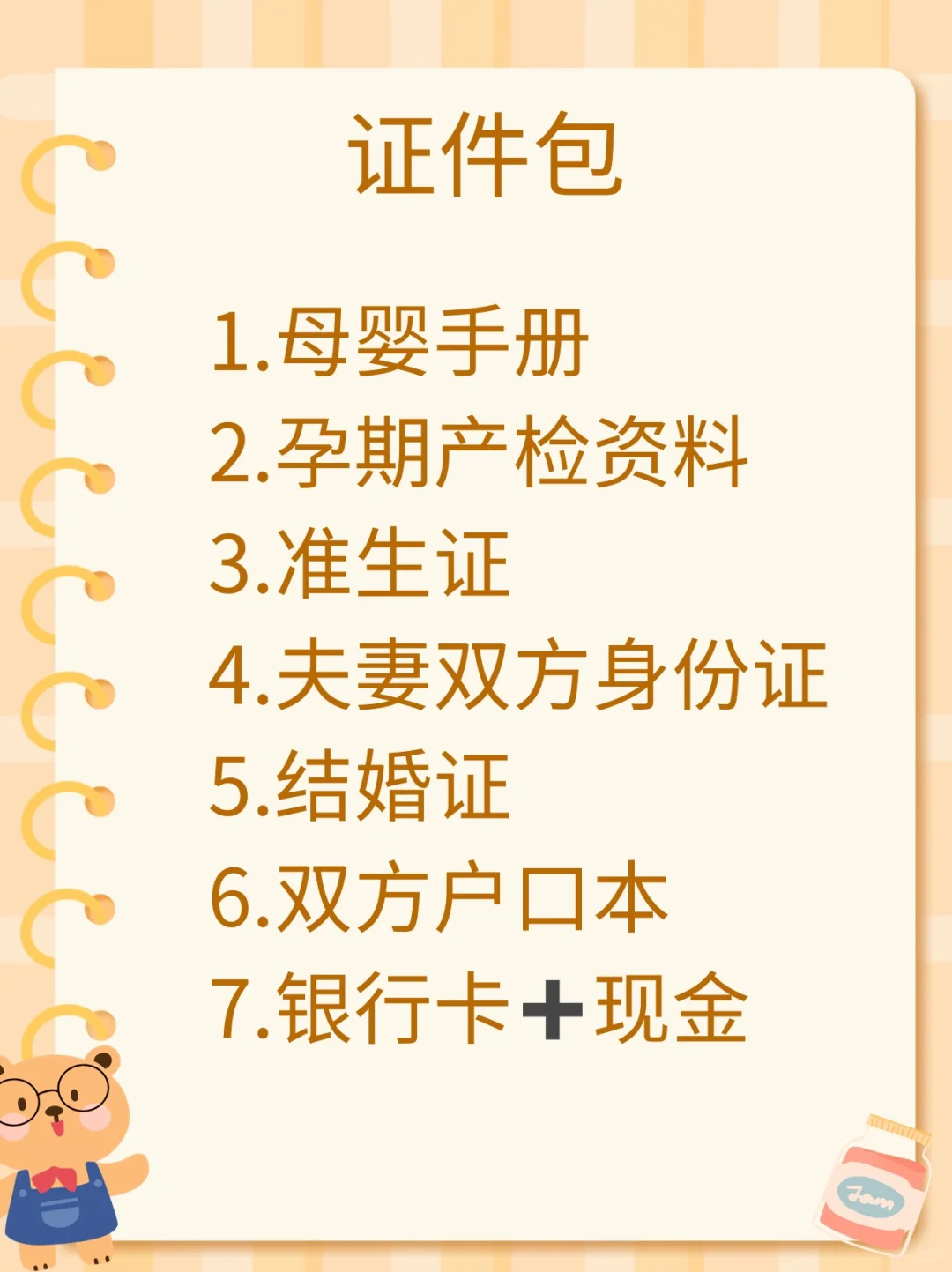 母婴手册、孕期产检资料、准生证、夫妻身份证、结婚证、双方户口本、银行卡➕现金