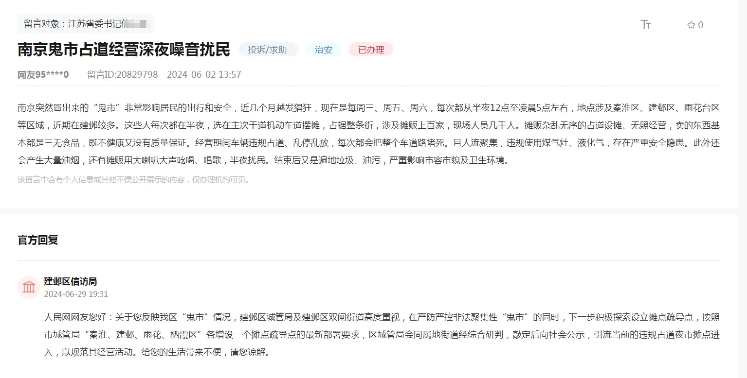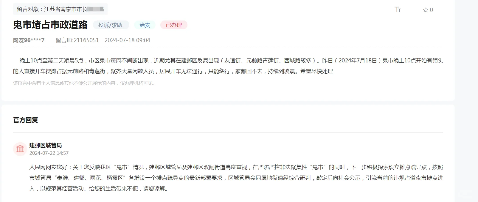 翻看人民网留言板,发现近期出现了不少相关投诉;而从回复也能看到,从6月开始,有关部门就已经在研究“在秦淮、建邺、雨花、栖霞区增设一个摊点疏导点”✅