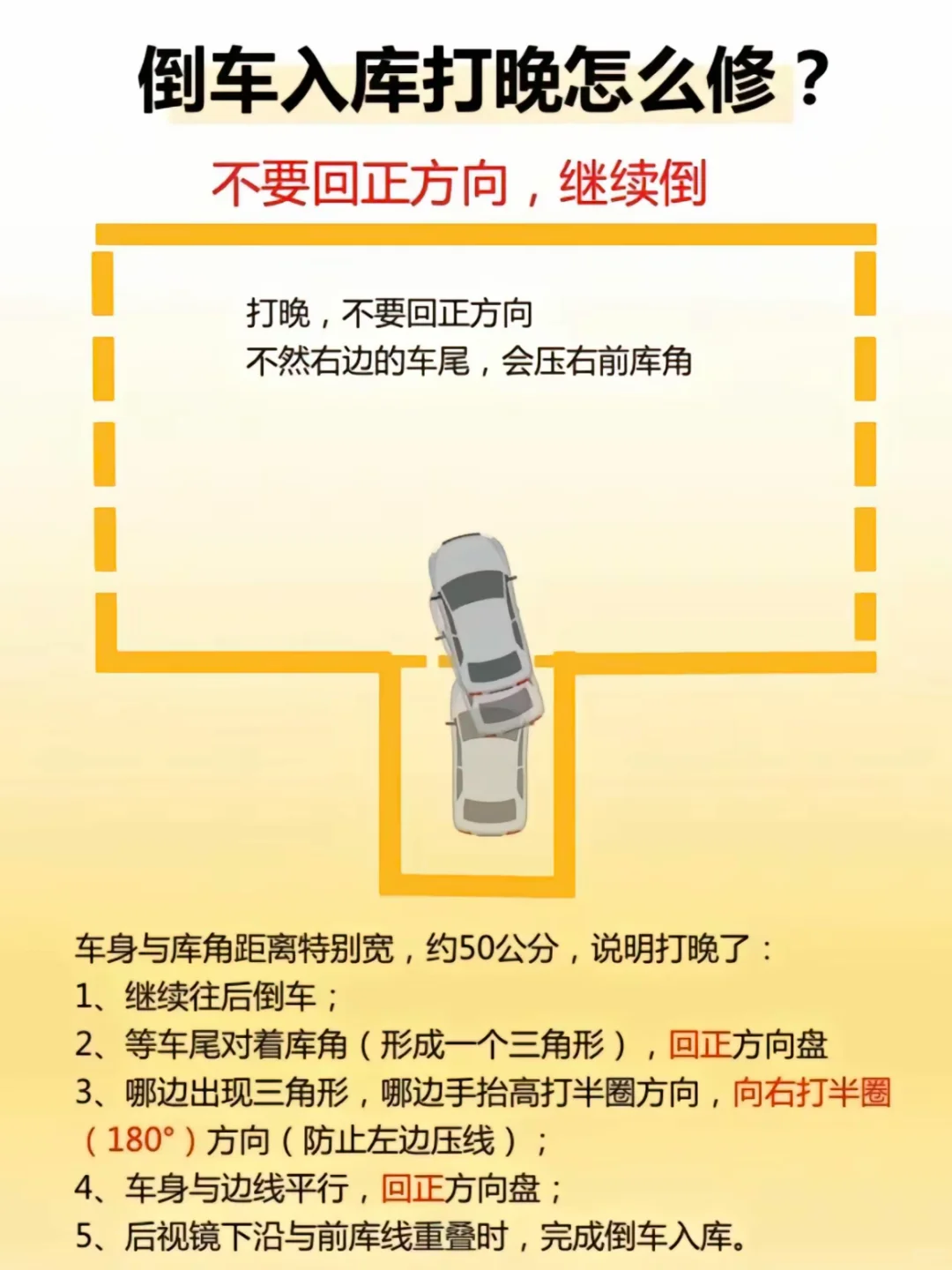 倒车入库打早怎么修 立即回正 打早就立即回正,形成直线往后退如果继续左打满往后倒,会继续往库角旋转 导致压库角 车身与库角到30公分处,车身是斜的,说明打早了: 1、立即回正方向盘,继续往后倒; 2、等左前门把手进库(或库角消失),再向左打满方向盘(车斜度大则打满,车斜度小则打一圈) 3、车身与边线平行,回正方向盘(哪边宽方向往哪边修); 4、后视镜下沿与前库线重叠时,完成倒车入库。