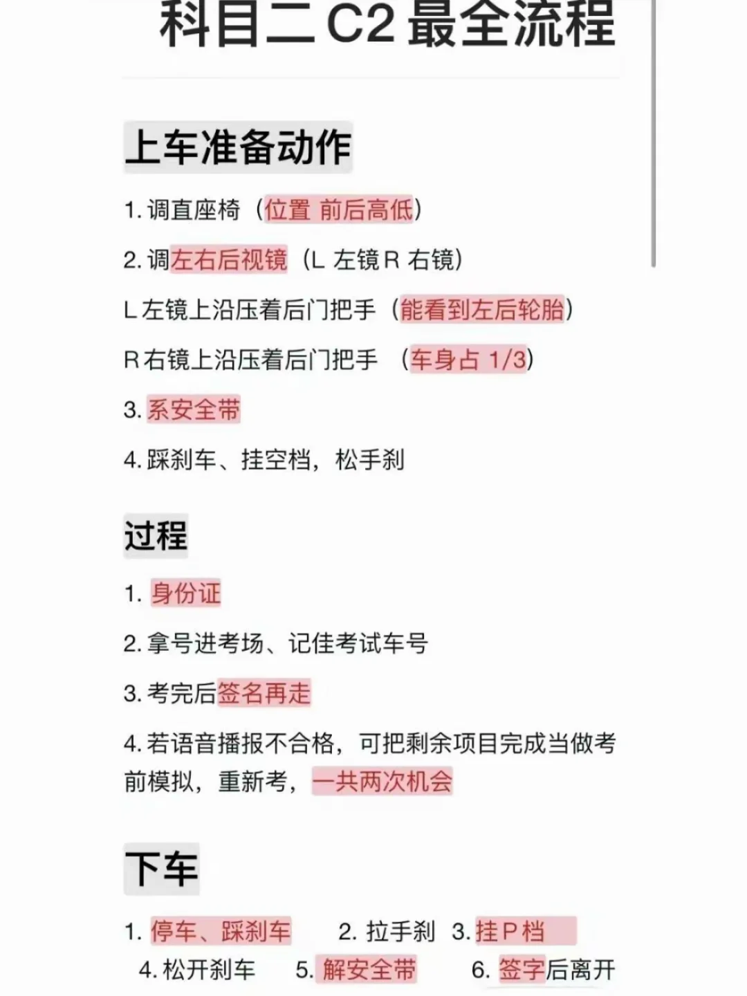 科目二C2最全流程 上车准备动作 1. 调直座椅(位置 前后高低) 2.调左右后视镜(L左镜R 右镜) L左镜上沿压着后门把手(能看到左后轮胎) R右镜上沿压着后门把手(车身占1/3) 3.系安全带 4. 踩刹车、挂空档,松手刹 过程 1.身份证 2.拿号进考场、记佳考试车号 3.考完后签名再走 4.若语音播报不合格,可把剩余项目完成当做考前模拟,重新考,一共两次机会 下车 1.停车、踩刹车 4. 松开刹车 2.拉手刹 3.挂P档 5. 解安全带 6. 签字后离开