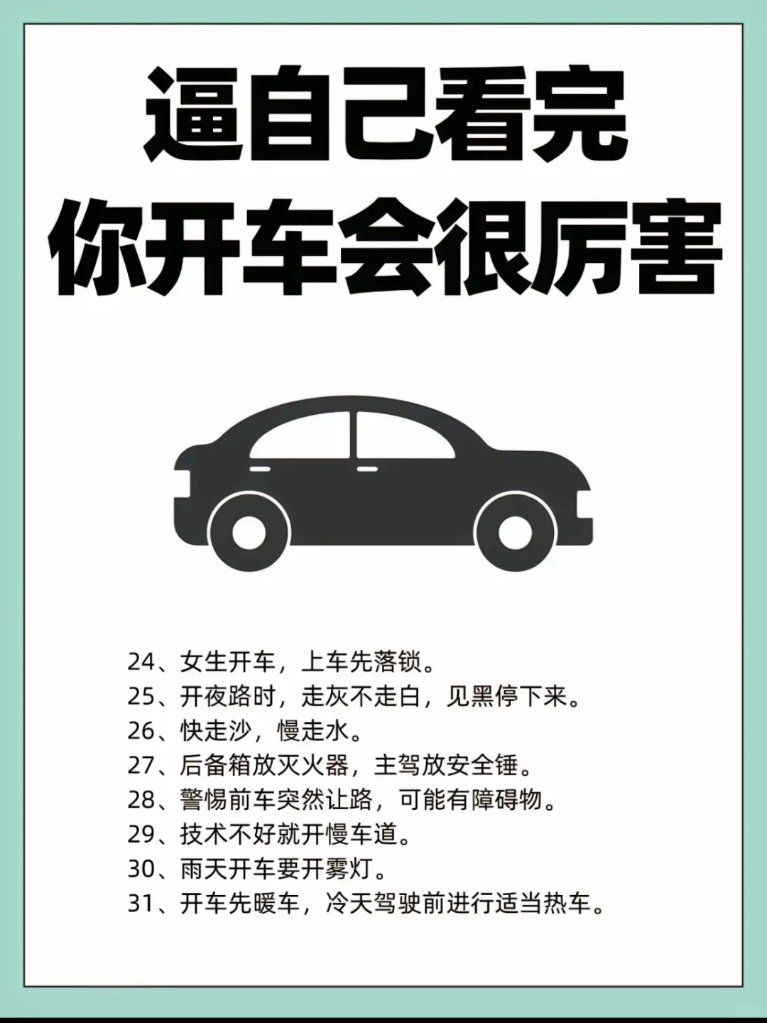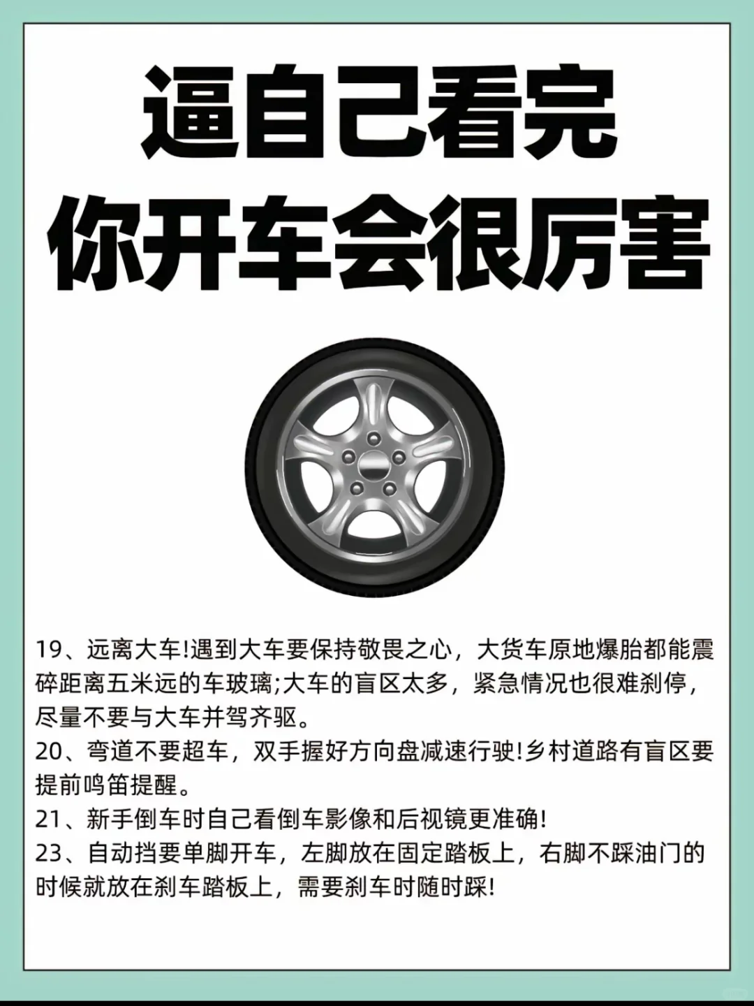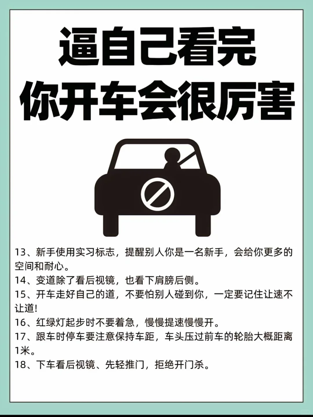 逼自己看完 你开车会很厉害 7、起步不超齐头车,在交通灯或停车后起步时,不要急于超过并排的车辆 8、在不熟的路段,按前车走过的路线走。 9、上车前绕车一周检查,看看周围是否有障碍物、小孩或动物,以及车辆是否有损坏。 10、注意A柱盲区,很容易遮挡部分视线。 11、夜间开车鸣笛比远近光交替更有效。 12、在转弯或通过路口时要额外小心,必要时通过摇头晃脑来改善视野。