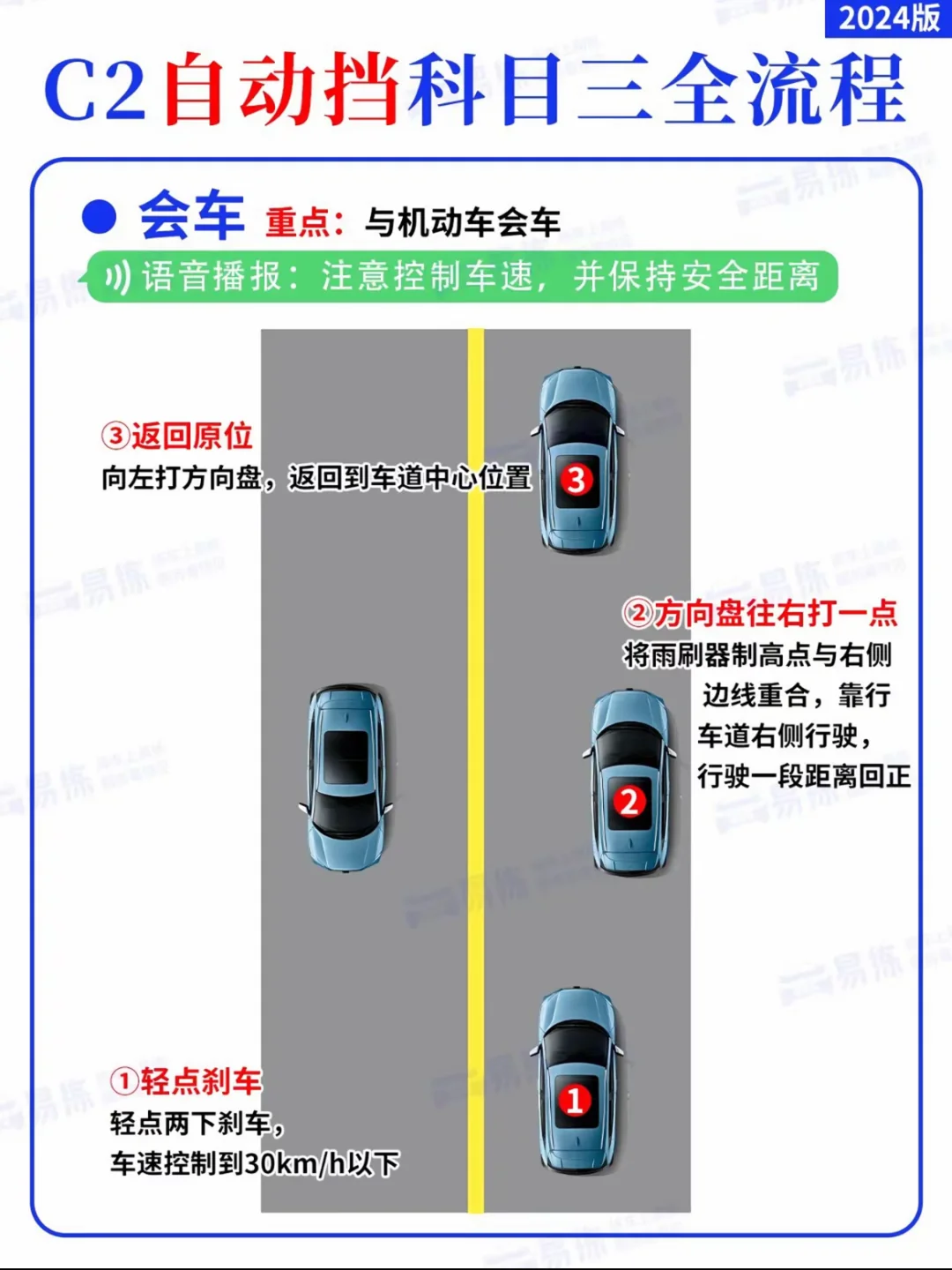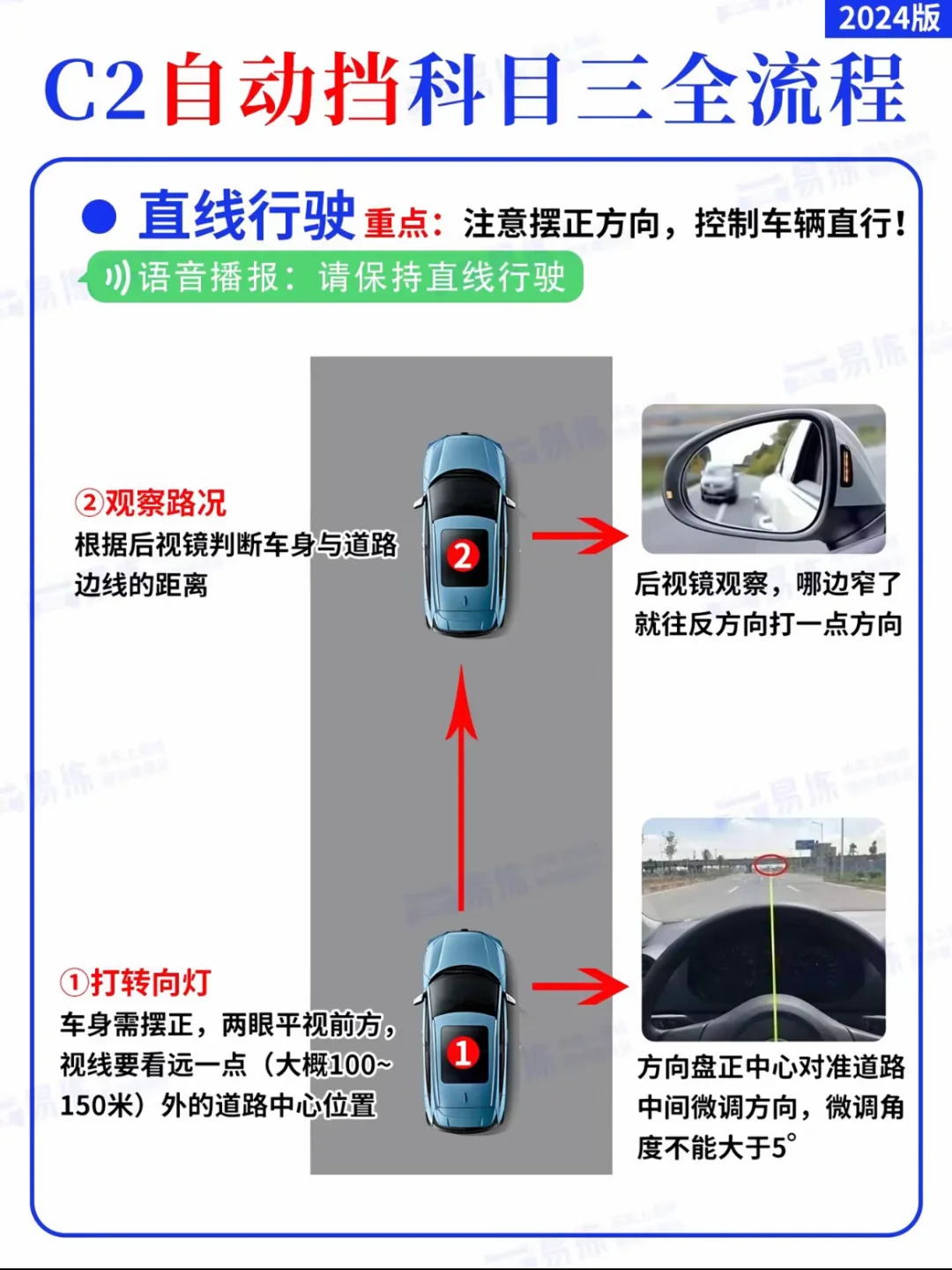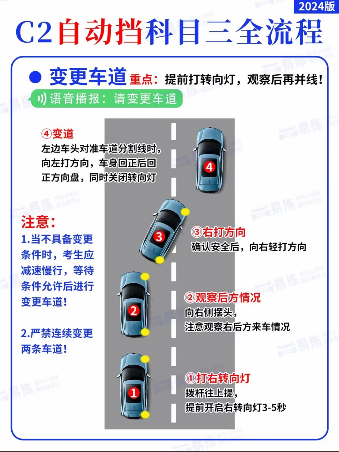 C2自动挡科目三全流程 • 左转弯 重点:左转转大弯 v 语音播报:前方路口左转 听到语音后,观察路况,如达到转弯条件,开左转向灯(大于3秒)后,观察路口来车情况,按导向箭头车道左转至行车道。如未达到,可在路口停车等待。 4 ④关闭转向灯 进入目标车道后,关闭转向灯 -- 3 ③左转 左转转大弯,方向盘不用打死(不要走到对向车道) 2 ②打转向灯 拨杆往下打开启左转向灯,减速,等待红绿灯信号 1 ①变道 变道至左转专用车道