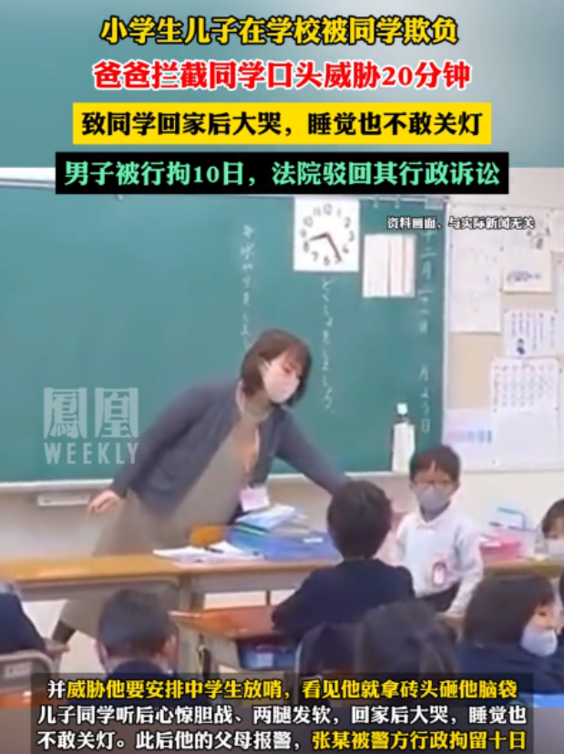 “这就校园霸凌的下场!”北京,一小学生遭遇同学校园霸凌,父亲得知后,怒而在放学后拦下霸凌者,放出狠话:“如果再敢欺负我儿子,等着砖头砸脑袋,被你父母照顾一辈子”,霸凌者听后吓尿了裤,回家后大哭,睡觉也不敢关灯。而霸凌者父母发觉后报警,警方对父亲作出行政拘留10日的处罚,父亲不服选择上诉,要求撤销处罚,法院这样判了!