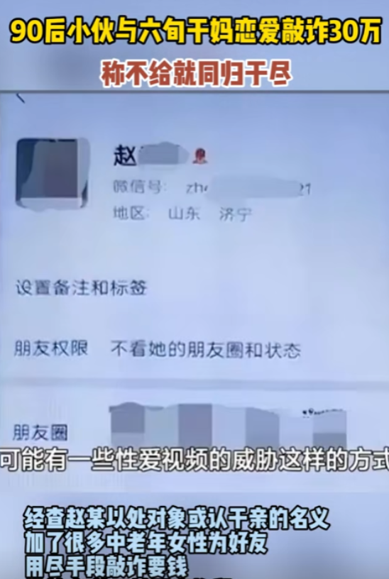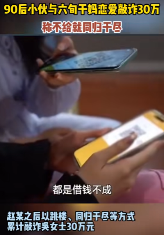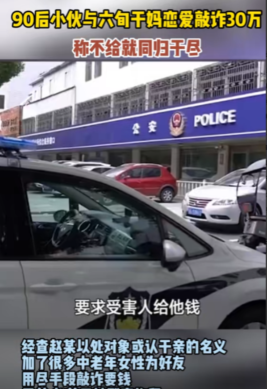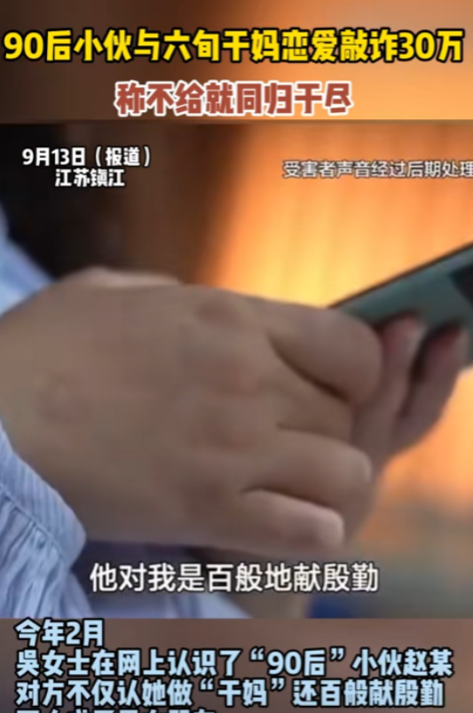 “想白嫖?”江苏,一60多岁大妈在网上被90后小伙搭讪,两人相识后小伙还认了大妈当“干妈”,见面后更是直接确立了“恋爱关系”,期间小伙一共从大妈这拿走了30万,大妈这才感觉到自己被骗了,于是赶紧报警,却不想报警后的结果,让大妈更加难以承受。 (主要信源:海报新闻2024年9月15日——90后小伙与六旬干妈恋爱敲诈30万 称不给就同归于尽,目前小伙已被刑事拘留) 你不是他唯一的“干妈”! 年纪大的阿姨,尤其是一个人住的阿姨,总是需要点陪伴和温暖,可是这样小的要求,竟然还成为了大妈被诈骗的原因! 吴女士最近就遇见这样糟心的事。 吴女士已经60多岁了,退休在家也闲着没事,家里又只有她一个人,丈夫和儿子也早早地离开了人世,吴女士一个人就成了一个家。 再加上退休前忙于工作,吴女士也就一直是一个人。 退休前到还好,可现在退休后,又没个人说说话,吴女士也觉得很孤单。 某天在玩手机的时候,吴女士在某个交友软件上认识了一个男生小赵(化名),小赵是90后,非常年轻健谈。 两人相识还是小赵先找的吴女士,小赵很体贴,经常对吴女士嘘寒问暖,两人虽然年纪相差比较大,但也总有共同语言可以聊,慢慢的两个人就熟络了起来。 一天在聊天的时候,小赵突然对着吴女士表白,说自己想和吴女士处对象。 这可把吴女士吓了一跳,两人之间相差这么大,怎么可能,于是吴女士拒绝了,但小赵也没放弃,转而表示自己可以认吴女士当“干妈”。 吴女士认为这样也行,还能有人陪陪自己,于是也就同意了。 后来小赵提出见面,两人就顺利“奔现”了。 在见面的相处中,吴女士感受到了久违的温暖和呵护,渐渐地,两人之间的“干妈”关系就变了味。 小赵和吴女士开始用情侣关系称呼对方。 吴女士本以为是自己孤单了这么久,终于有人来关注她了,可没想到的是,这段关系的发展,出乎了她的意料。 两人出了一段时间后,小赵突然表示自己需要做个手术,但自己身上没钱,希望吴女士可以帮帮忙。 吴女士虽然有钱,但毕竟是一个人,留点钱今后可以给自己用,所以吴女士拒绝了小赵要钱的请求。 没想到小赵直接就炸了,完全没了之前温柔体贴的模样,而是用两人同归于尽来威胁吴女士。 甚至他还开始了自残,这样过激的行为吓坏了吴女士,于是答应了小赵的要求,给他拿了10万。 但事情到了这个地步,吴女士认识到了小赵的可怕,不想继续这段关系,于是提出了分开。 可没想到小赵不仅没有离开,反而用各种理由威胁吴女士,让她拿钱。 毕竟年纪大了,吴女士也不想自己老了的名声被这样的人破坏,于是也就给了钱,前前后后一共拿出了30万,就当破财消灾了。 可后来吴女士觉察到了不对劲,于是选择了报警,很快警方将小赵抓住了,可事情的真相,让吴女士破大防。 原来小赵不是只有她这一个“干妈”,还有好几个“干妈”,他就是利用这样的行为,来从大妈手中敲诈! 这让吴女士难以接受,网友们也纷纷被惊到了,只能说这男的是真的不想努力了,竟然好意思对老太太下手! 确实,赵某的行为确实是很过分,利用中老年女性的情感空缺来骗取信任,进而骗取钱财,只能说老年人也不安全。 中老年的情感需求也很重要,对于儿女来讲,不是简单的赡养就行,对于没有儿女的老人来讲,这种情感需要就更大了。 我们还是要多多关注老年人的需求,多给他们做些宣传,防止下一个“吴女士”的出现。