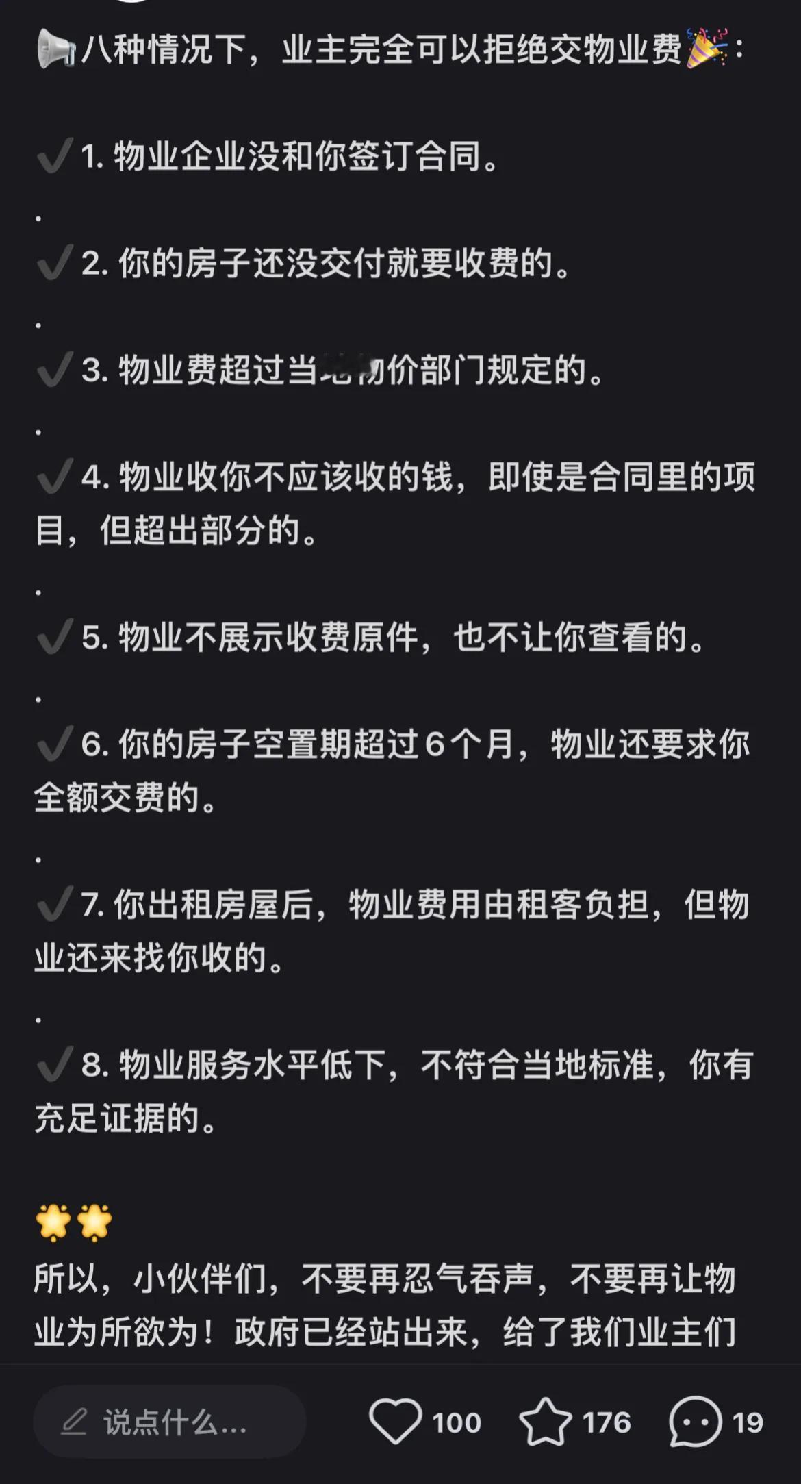 今天看到一个网友发的帖子,房子没人住超过三个月,可以申请减免物业费80%,是真的吗? 有小区物业规定,不住的房子也要全额交物业费。 但这种规定不合理,房子不住了小区的物业服务也没享受过,不应该交,房子不住人,应该减免物业费。 第一,没有产生垃圾。不需要清运,第二,没有使用电梯,也不用打扫,第三,人不在家,网线也不需要你维护。凭什么给你交全额的物业费呀?查了一下,律师也是这么说。 对此情形你怎么认为呢?到底房子空闲超过多少个月可以不交物业费呢?或者有收取比例吗?(图片来源网络)