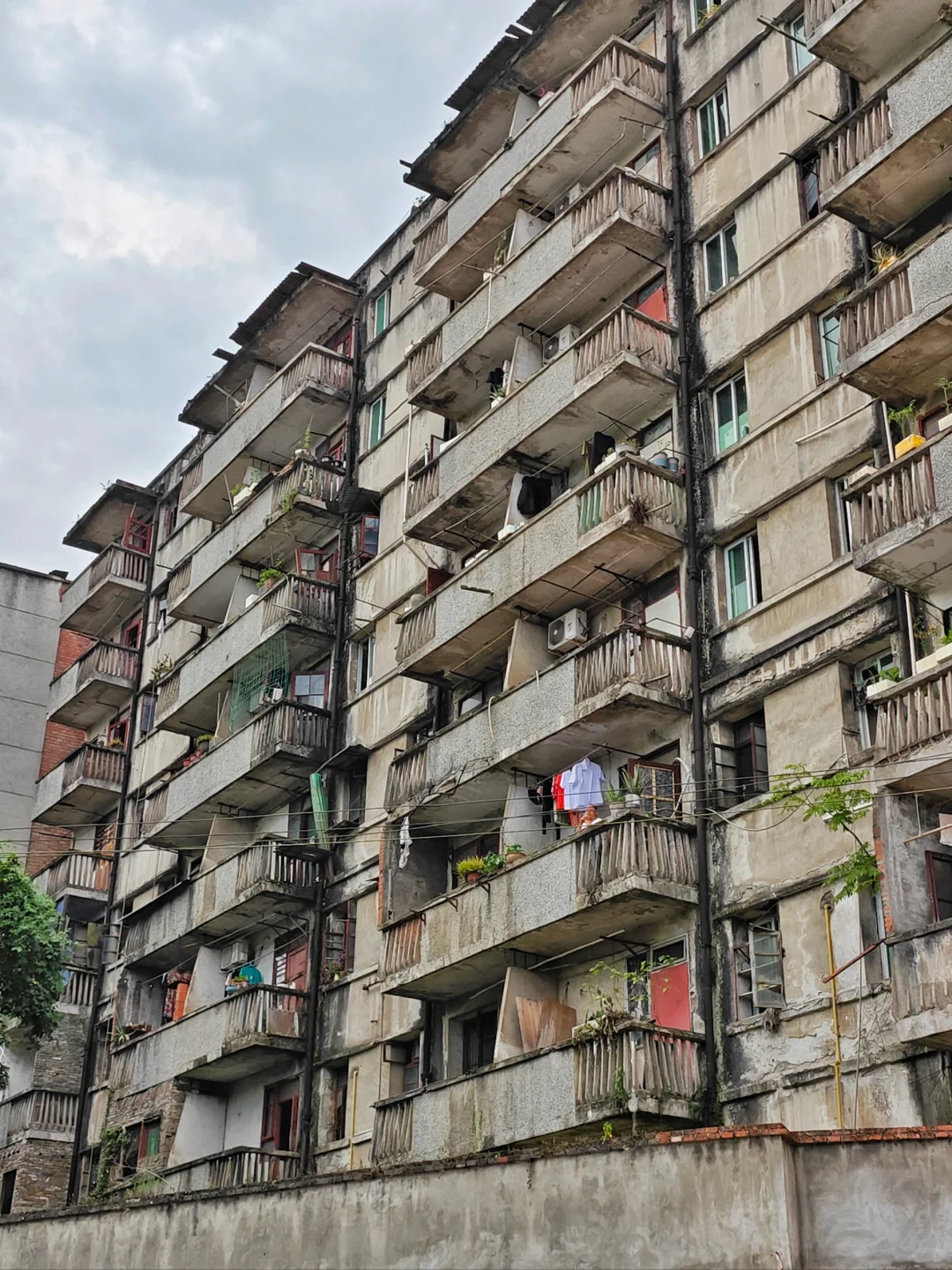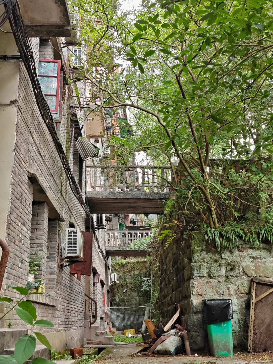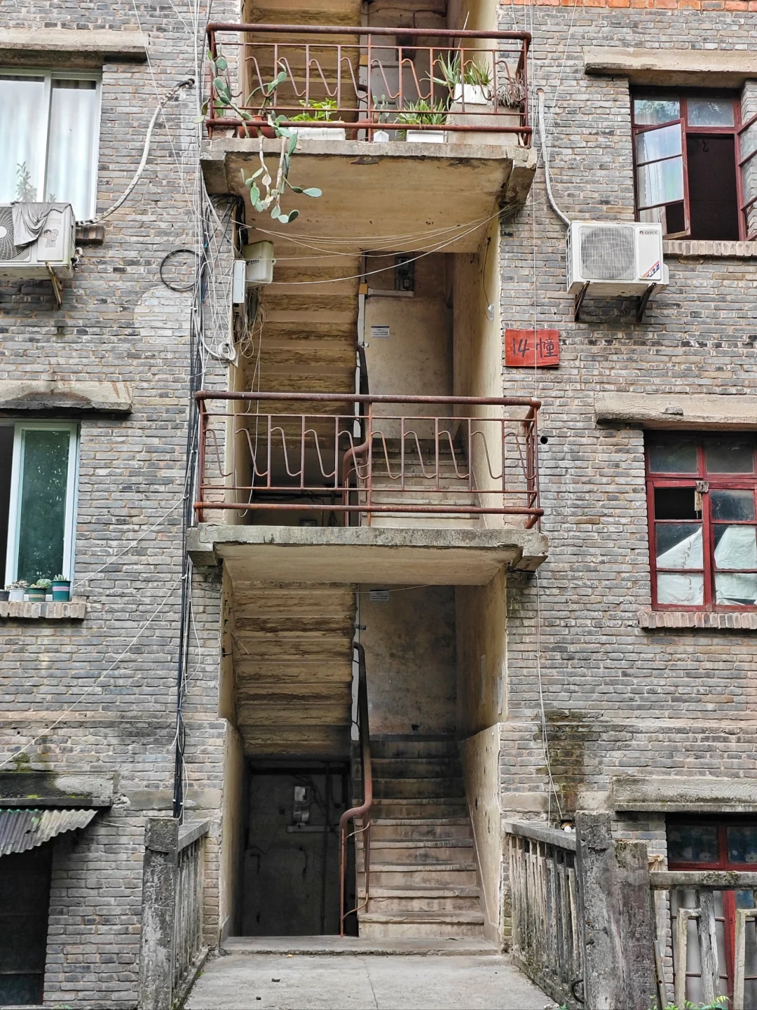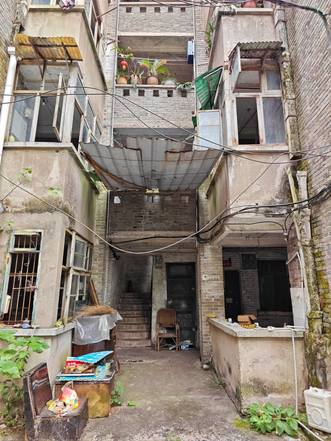 老家属区现在剩的原住居民很少,很多房屋空置了,有的家属楼租给了其他单位,比如附近养老院的员工居住。这些家属楼几乎全是六七十年代修建的筒子楼,但有少数几栋四层小楼是八十年代初修建的套房。走在家属区明显感到非常冷清,没有什么人活动,树木茂密,山坡上更是灌木杂草丛生,还有几栋完全废弃的家属楼,可见大部分原来住户已经搬走。
