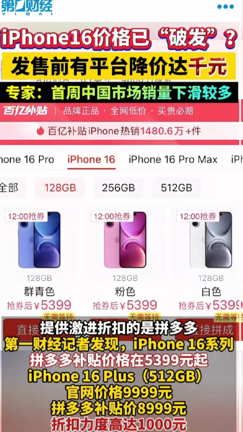 果然都是假的!苹果专卖店的排队长龙都是假象,苹果16首日就破发,有平台最高补贴1000元,黄牛能炒得起来?还有必要去排队?网上买不是更香! 昨天苹果16正式上市,杭州、上海、重庆、北京等地苹果专卖店门口一大早就排了看不见尾巴的长队,造成了一种火热、抢购、果迷的幻象。 每一个路过的行人、网上的传播等等,无不是在彰显苹果手机的实力! 紧接着,网购平台出来打脸了! 所有型号的价格均破发,最低5399元,比官网还便宜600元,最大的折扣出现在Plus 512G上,1000元的补贴够不够? 业内人士预计,苹果16今年国内销量还得再降12%! 黄牛直接哭晕在厕所! 低版本的128、256还过得去,至少不大会亏,可是512甚至1T的,这是要了老大一碗血啊!