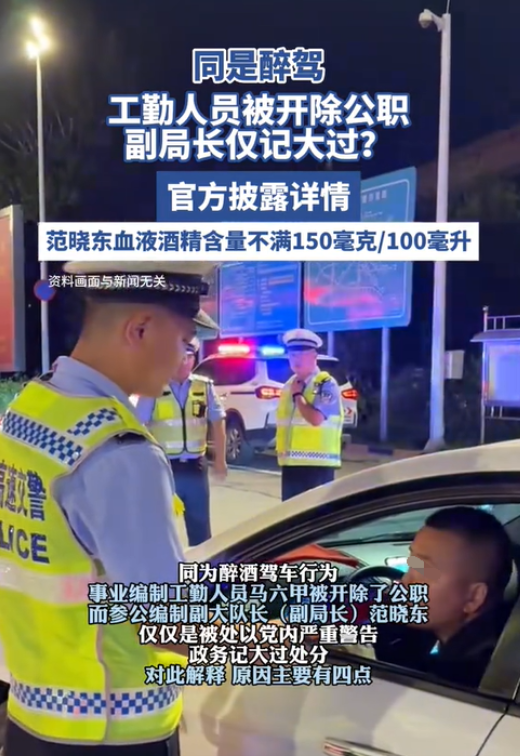 副局长醉驾就罚得轻?河南安阳,一名副局长醉驾被查后,纪委对其作出了党内严重警告并记大过的处罚。可另一名事业编的人员醉驾,竟被开除公职,拘役和罚款。网友:为什么同为醉驾,处罚相差这么大?目前,纪检纪委给出的回应是:双方情节轻重不同。