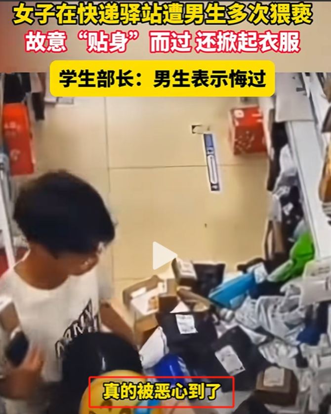 (来源:南昌晚报2024年9月19日关于《9月19日,浙江,女子在快递驿站遭男子多次猥亵,故意“贴身”而过,还掀起衣服,学生部长:男生表示悔过》的报道)(文中均为化名)