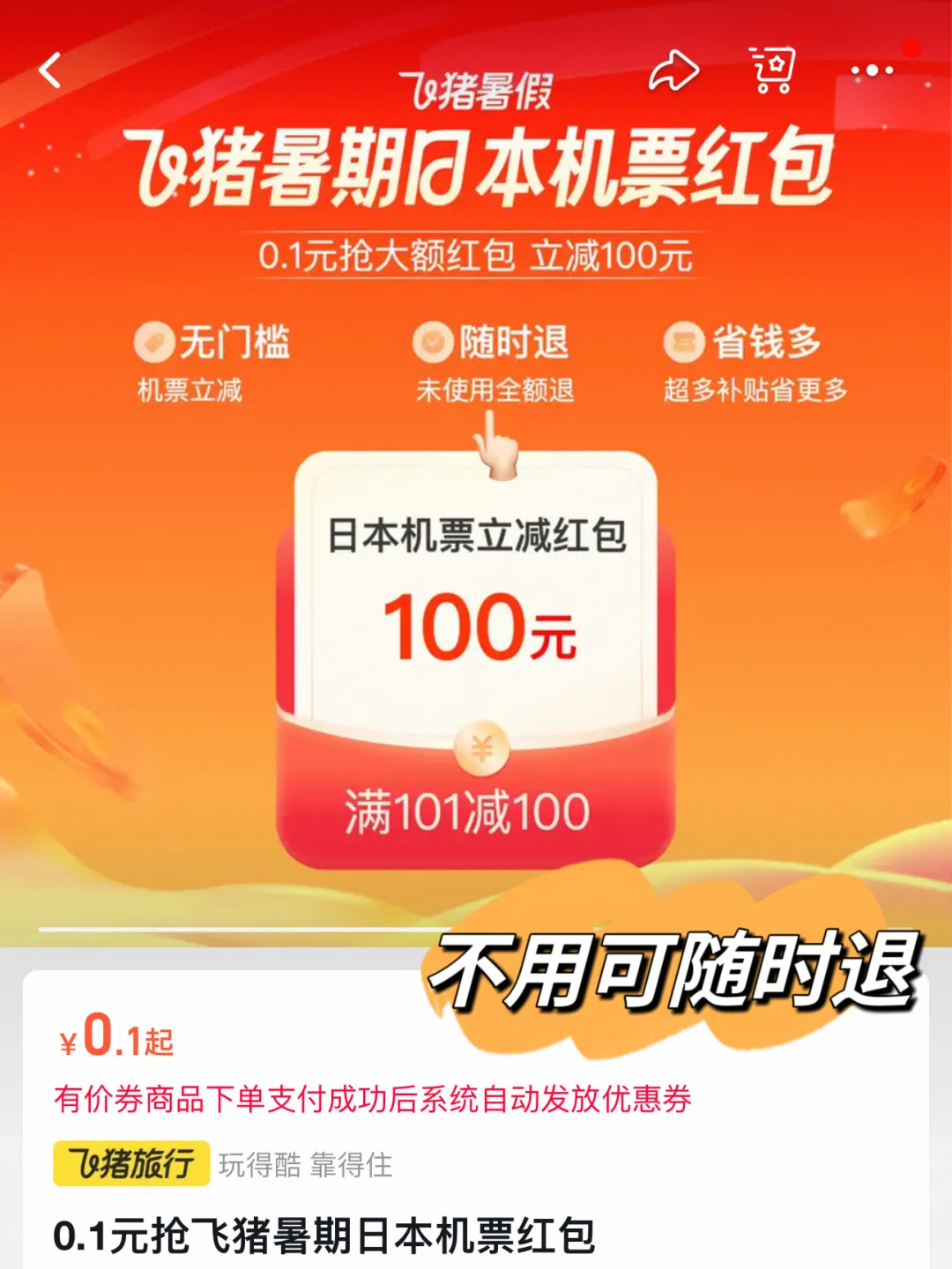 [三R]每天11点【0.1元抢100元飞机红包】满101就能用,用不上还能随时退!