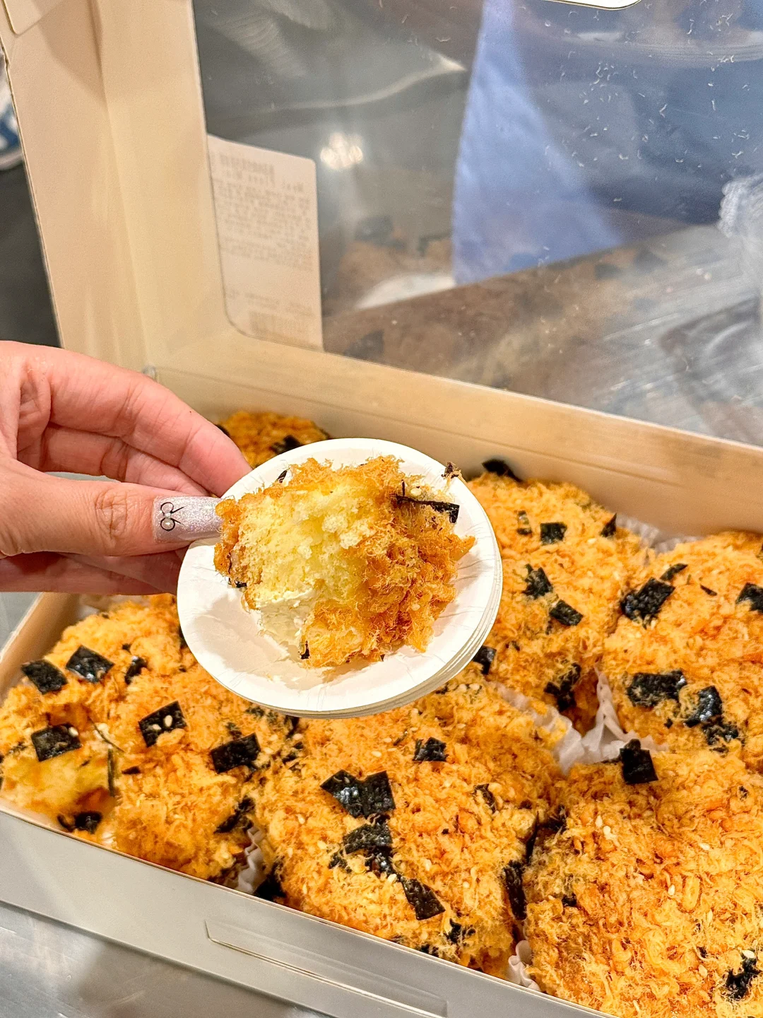 来逛开市客了~ 偶遇顶流草莓熊🐻 一起美美购入海苔肉松生乳巧贝蛋糕 酥脆的肉松裹满整个蛋糕 外面还有碎碎的海苔片 整个料给的特别足! 内陷绵密柔软 吃起来口感丰富 完全不会腻 一盒六个 🍞🥯🥐🥖🥞 正好硬控我一周早餐!! 真的很爱ᰔᩚ - 📍开市客(南京店) -