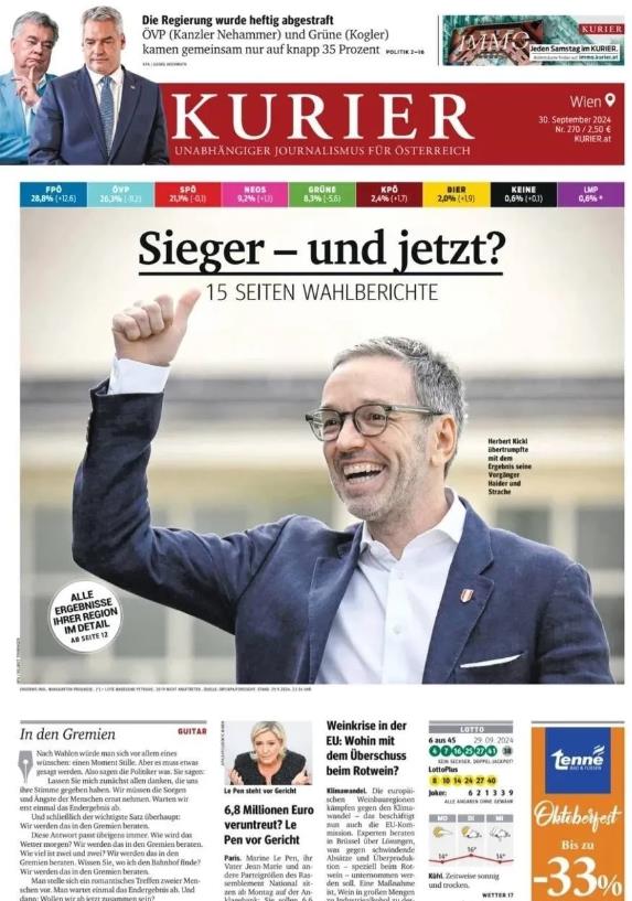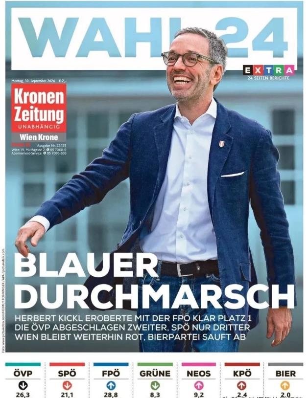奥地利大选结果出炉,极右翼自由党赢得胜利。该党党魁赫尔伯特·基克尔登上9月30日奥地利各大报纸的头版头条,其所在政党在昨日议会选举中首次夺得榜首。