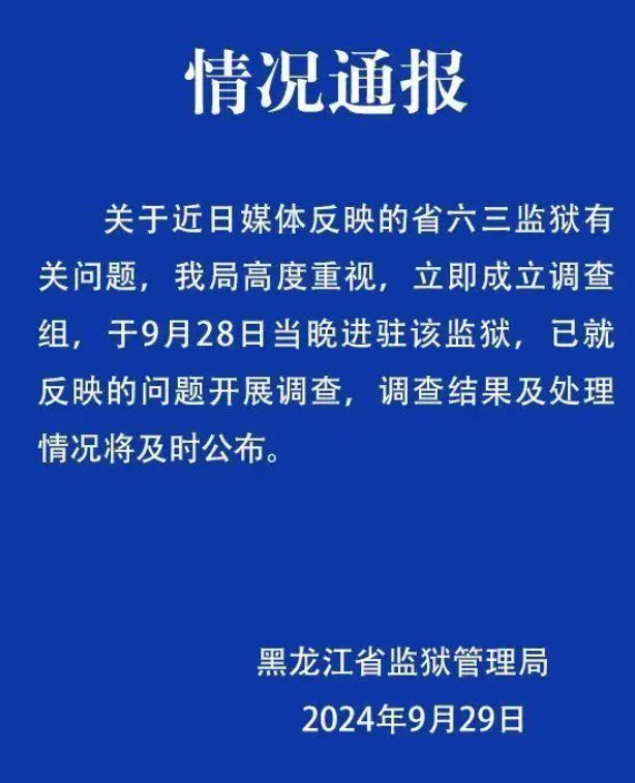 “严查到底!”黑龙江,一男子刚从监狱里出来,就实名举报监狱乱象,声称在狱警的默许下,服刑人员长期在监区里打牌、赌博,还违规使用手机,并向记者提供不少照片作为证据。然而,随着记者进一步调查,男子实名举报的原因,让人惊掉下巴。 王勇生活在黑龙江,是当地一所监狱刑满释放的人员,然而在从监狱当中刑满释放之后,王勇却向当地的相关部门直接举报了自己所在的监狱。 还将自己所在的监狱告上了法庭,那么这是怎么一回事呢?事情还要从2010年开始说起。 2010年12月,王勇因为一时的贪念导致自己走上了歪路,在一次盗窃过程中被执法人员抓获,最后被依法判处了有期徒刑15年。 而在判刑之后,王勇于2018年被转入到了当地的一所名为六三监狱的监狱当中进行服刑。 原本刚刚被转入这所监狱的时候,王勇心中还有些惶恐,可是当他被转入这所监狱之后,却发现这所监狱和他想象中的监狱存在着很大的不同。 因为在来到监狱当中之后,王勇发现这所监狱相比于其他监狱而言,尤其是自己先前所在的监狱相比管理非常的宽松。 在里面服刑的人员不仅可以在监狱当中打牌赌博,甚至还可以使用手机和外界进行联系,而对于这种行为,监狱的狱警确是默许的。 据王勇在举报六三监狱当中存在着的乱象时提供的相关照片我们可以看到,在照片中多名穿着狱服的人员围坐在一起打牌。 在几人打牌所用的床上甚至还放着很多的现金,而尽管这些服刑人员在打牌的时候通常会发出巨大的声响,可是监狱中的干警在发现这一情况的时候,却仅仅是看一眼就离开了。 并没有对这一违规行为进行阻拦,更没有对涉事的违规人员作出任何的处罚。 而除了这些之外,该监狱的狱警甚至还允许监狱内的服刑人员私自使用手机和外界的人员进行联系,生活就如同在外界一般。 这些相关的证据都被当时一名受到服刑人员和狱警排挤的另一名服刑人员所拍摄了下来,后来被王勇保存了下来。 那么这些对于服刑人员来说非常有益的事情,为什么身为服刑人员的王勇,会将这些事情举报给相关的部门的呢? 原来,王勇之所以举报监狱当中所存在的乱象,完全是因为2019年一件事情的发生。 2019年3月,王勇在准备回到自己的床铺上休息的时候,不小心导致自己的下体磕碰到了金属栏杆。 这使得他的睾丸受到了巨大的伤害,然而在王勇的睾丸受到伤害而出现疼痛的情况之后,狱警却一直在拖延,并没有第一时间带着他前往当地的医院接受治疗。 并且给在治疗期间,王勇还被狱警多次带到了潮湿的禁闭室进行个例,这使得他在术后出现了伤口感染的情况。 最后在狱警的一番拖延和不恰当的行为下,王勇的左侧睾丸最终被诊断为坏死,这对于王勇的生活造成了极大的影响。 也正在这样的一个情况下,王勇才决定,要对监狱内的乱象进行举报,因为在王勇看来正是因为监狱内的管理不当,才导致了自己睾丸坏死。 除此之外,王勇在出狱之后还将医院以及监狱方面告上了法庭,要求双方赔偿自己各种损失共计57万余元。 目前此案尚且还在审理当中,尚且没有具体的判决结果。 而对于王勇向相关部门举报一事,相关部门在得知情况之后,也是对此事格外的重视,在9月29日相关部门对此发布公告称。 目前已经成立了调查组,到涉事的监狱进行调查,尚且没有具体的结果,但是我们有理由相信,在不久之后真相必将会大白于天下。 那么对此,您持有怎样的看法呢? 今天的分享到这里就结束了,大家对此事有何看法,欢迎在评论区留言和讨论,感兴趣的可以点击头像加关注,我将每日更新优质内容,我们下期见。 信源: 原文登载于极目新闻2024年9月30日关于《刑满释放人员举报黑龙江一监狱内犯人聚众赌博、用手机与外界通联,官方回应:已成立调查组》的报道