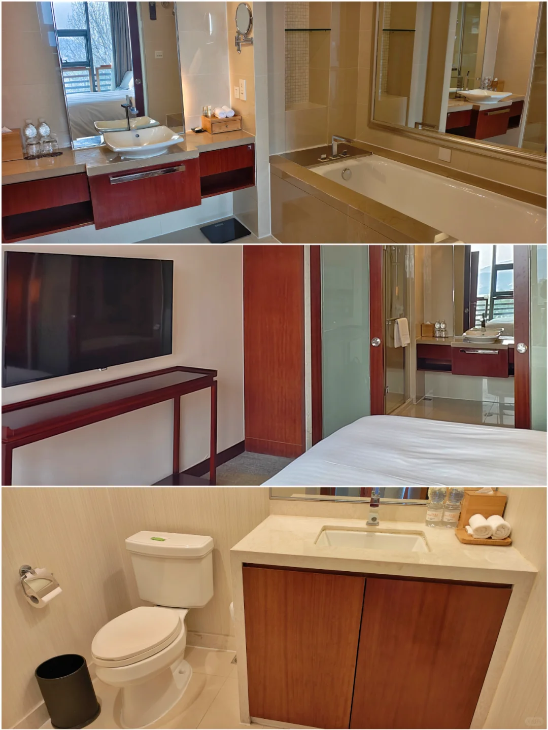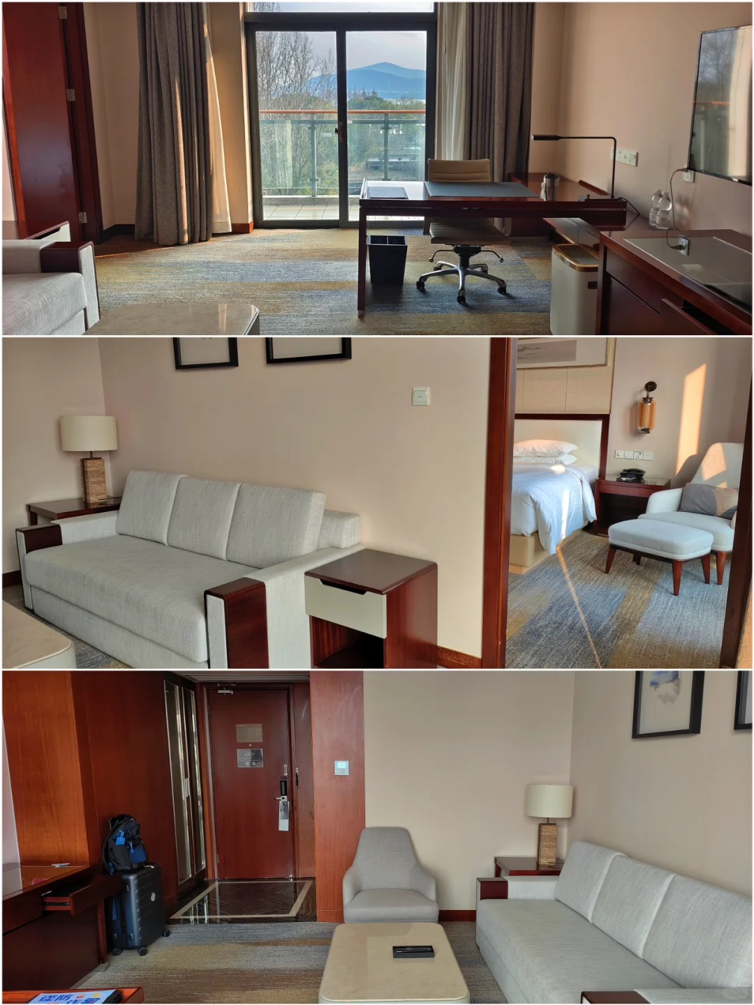 这家酒店体量很小,一共才5楼,套房更是少,只有四间。这次入住居然也给升级到了套房,还是顶楼的,视野不错。套房面积不大,客厅还有个小阳台,阳台外能直接看到远处的鼋头渚,太湖等等。小套房居然有主、客两个卫生间,欢迎礼没有给水果,给了一堆小点心。(P5~P8)。