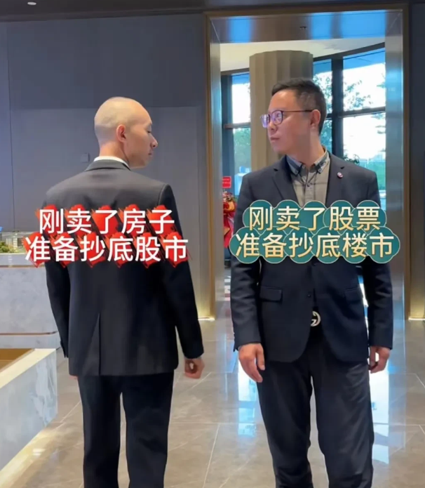 据说现在房地产交易大厅,一拨人卖了房,准备进股市抄底。另一拨人,刚从股市中套现,准备扫房子。两队人马擦肩而过,互相瞟了一眼,心底都念了一个词:sb……