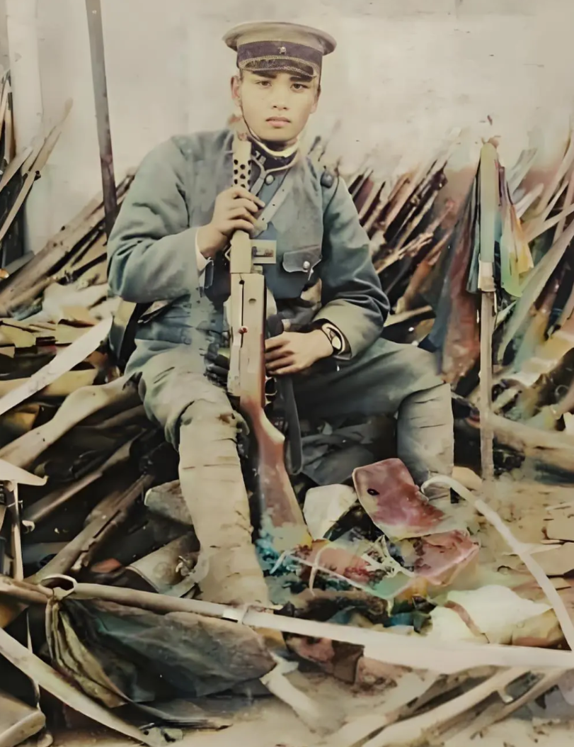 一名日军78连队士兵,坐在被缴获的东北军的武器前合影,他手里拿着一把冲锋枪——德国MP18冲锋枪,俗称“花机关”。 在日军身后的墙根处,堆满了各种步枪和大刀。地上横放着一把环首刀,刀把上系着红布,特别引人注目