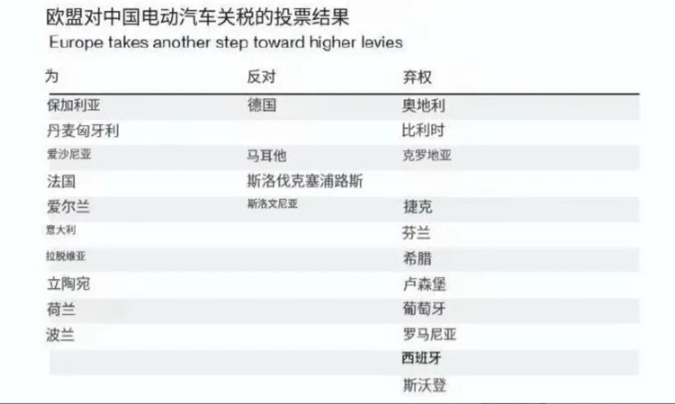 欧盟通过涉中国电动车加税决议投弃权票的12个国家 第一,西班牙; 第二,奥地利;