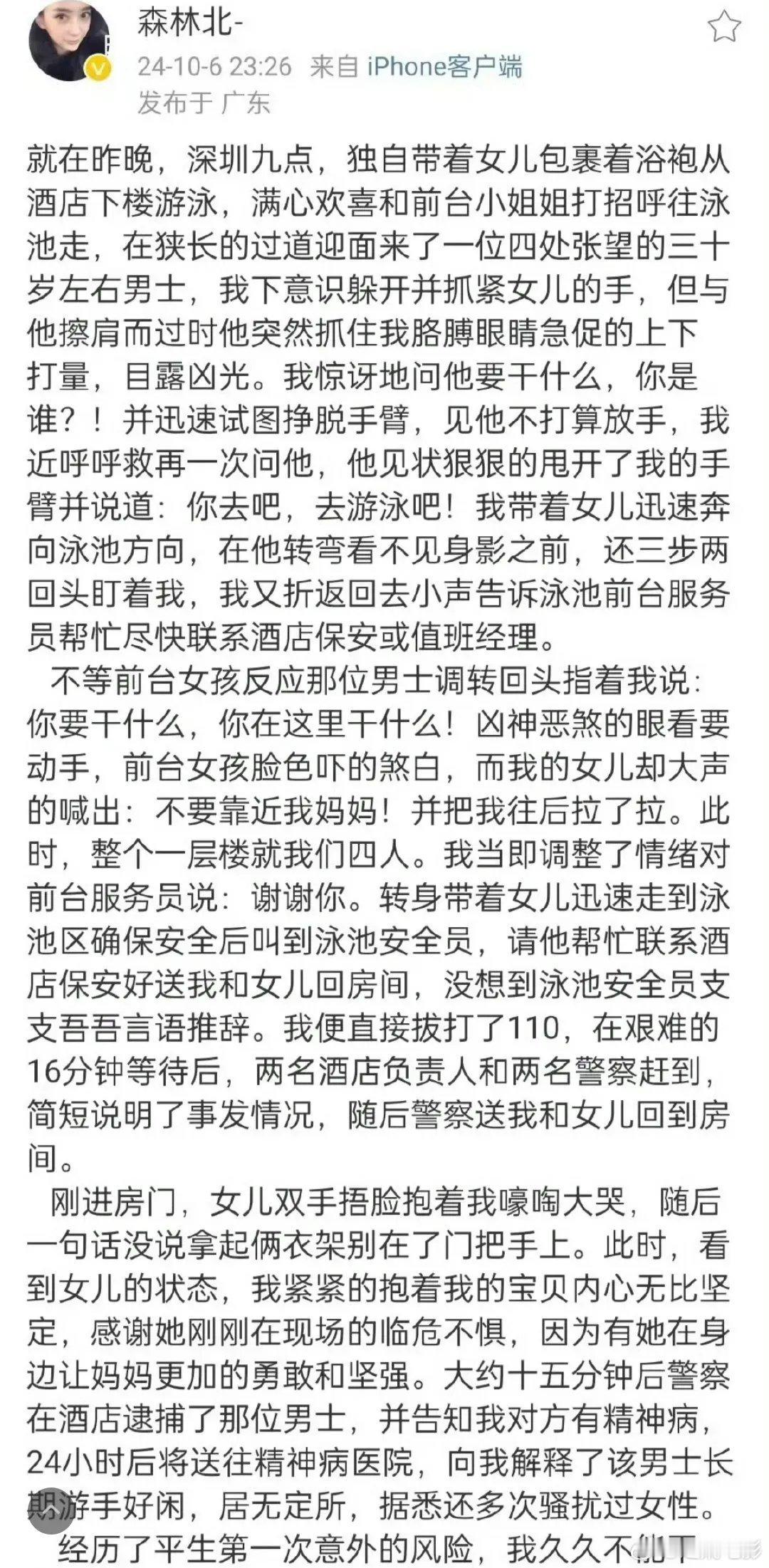 根据森林北深夜发长文,她带着孩子在深圳住酒店,准备带孩子去泳池游泳时,途中遇到一个40多岁目露凶光的男人,突然用手拽着她,在拉扯中,男人恶狠狠的丢下一句“那你们去游泳吧”,就走了。