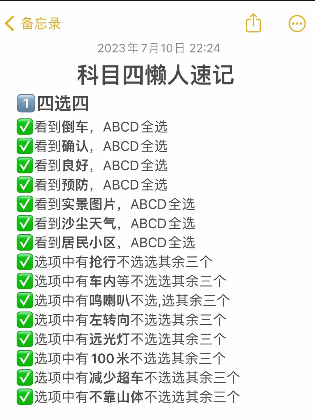 科目四懒人速记 ①四选四 看到倒车,ABCD全选 看到确认,ABCD全选 V看到良好,ABCD全选 看到预防,ABCD全选 看到实景图片,ABCD全选 看到沙尘天气,ABCD全选 V看到居民小区,ABCD全选 选项中有抢行不选选其余三个 选项中有车内等不选选其余三个 选项中有鸣喇叭不选,选其余三个 V选项中有左转向不选选其余三个 选项中有远光灯不选选其余三个 选项中有100米不选选其余三个 选项中有减少超车不选选其余三个 选项中有不靠山体不选选其余三个