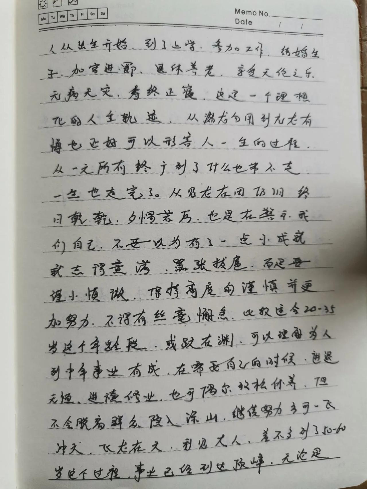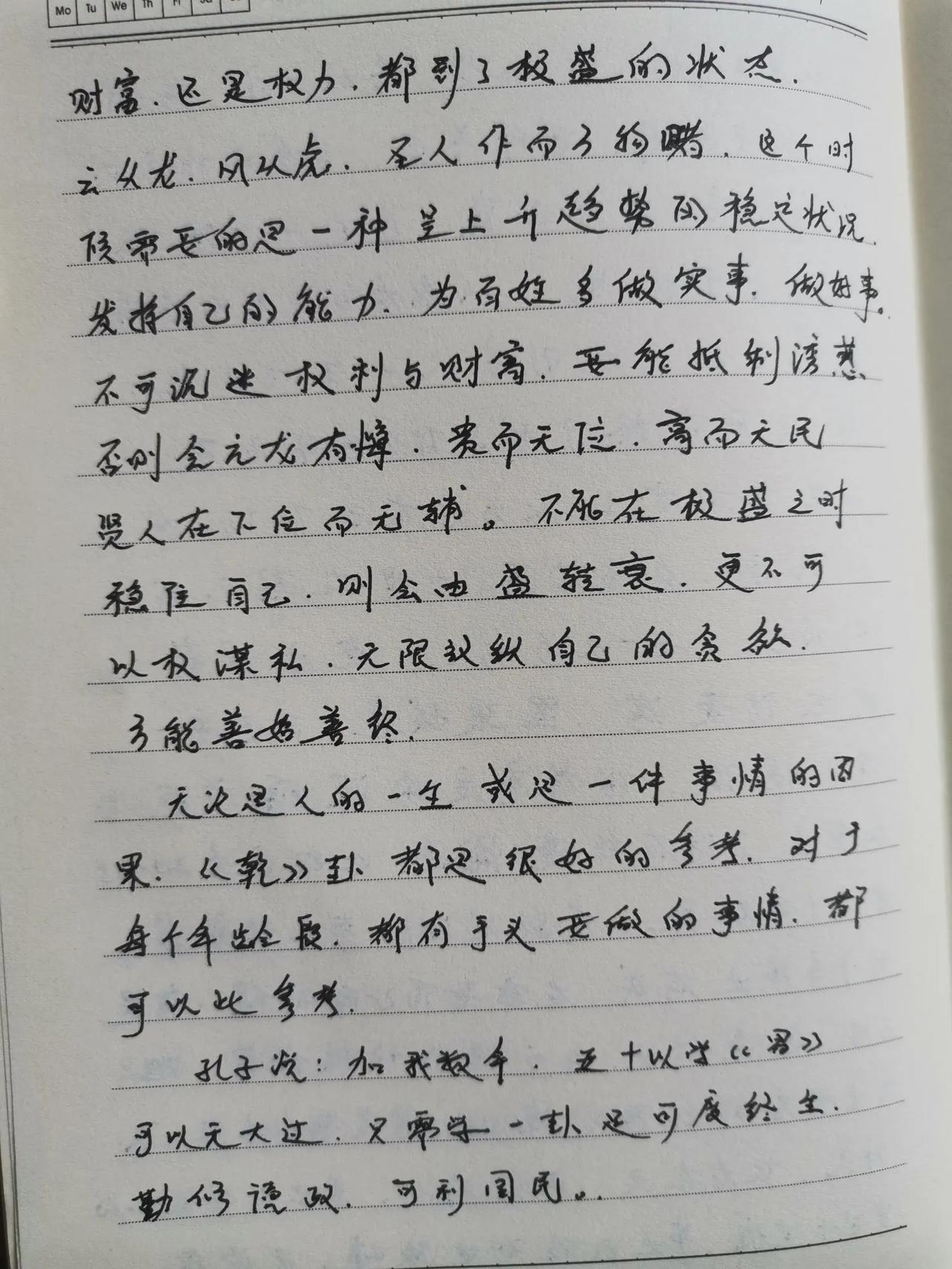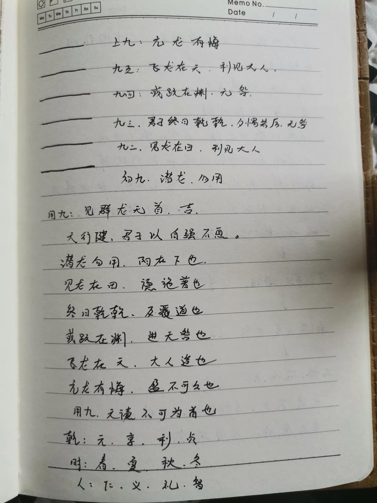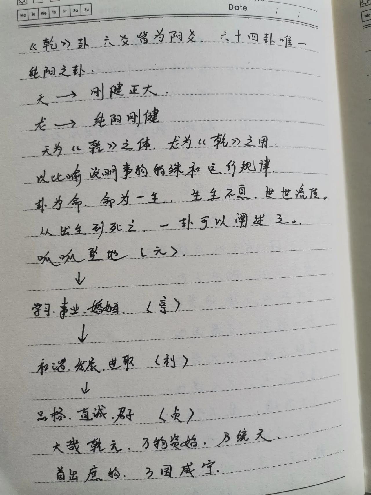 人从出生开始,到了上学,参加工作,结婚生子,加官晋爵,退休养老,享受天伦之乐无病无灾,寿终正寝,这是一个理想化的人生轨迹。 从潜龙勿用,到亢龙有悔也正好可以形容人一生的过程。从一无所有开始,终于什么也带不走,一生也走完了。 从见龙在田仍旧终日乾乾,夕惕若厉,也是在警示我们自己。不要一以为有了一点小成就志得意满,嚣张拔扈。而要谨小慎微,保持高度的谨慎并更加努力,不得有丝毫懈怠。比较适合20-35岁这个年龄段。 或跃在渊,可以理要为人到中年事业有成,在需要提升自己的时候,进退无恒,进德修业。也可偶尔放松休养,但不会脱离群众,隐入深山。继续努力方可一飞冲天,飞龙在天,利见大人。 差不多到了50~60岁这个过程,事业已经到达顶峰,无论是财富,还是权力,都到了极盛的状态。云从龙,风从虎,圣人作而万物睹。这个时候需要的是一种呈上升趋势的稳定状况,发挥自己的能力,为百姓多做实事,做好事。 不可沉迷权利与财富,要能抵制诱惑。否则亢龙有悔,贵而无位,高而无民,贤人在下位而无辅。不能在极盛之时稳住自己,则会由盛转衰,更不可以权谋私无限放纵自己的贫欲,方能善好善终。 无论是人的一生或是一件事情的因果,《乾》卦都是很好的参考,每个年龄都有手头要做的事情,都可以此为参考。 孔子说过。加我数年,五十以学《易》可以无大过。只需读懂一卦足可度终生,勤修德政,可利国民。而如今不足三十,多读书,应该可以少一些过错了吧!