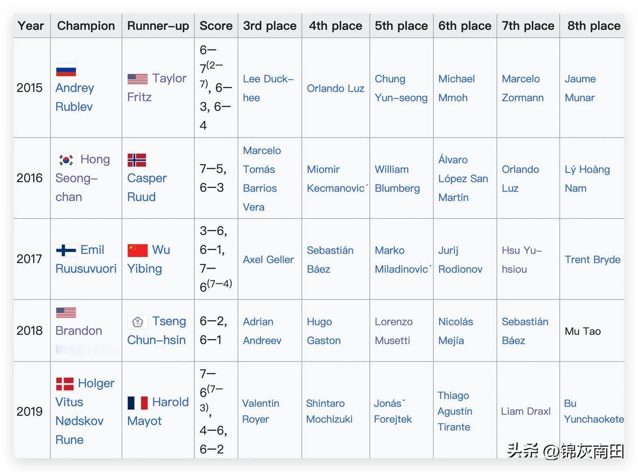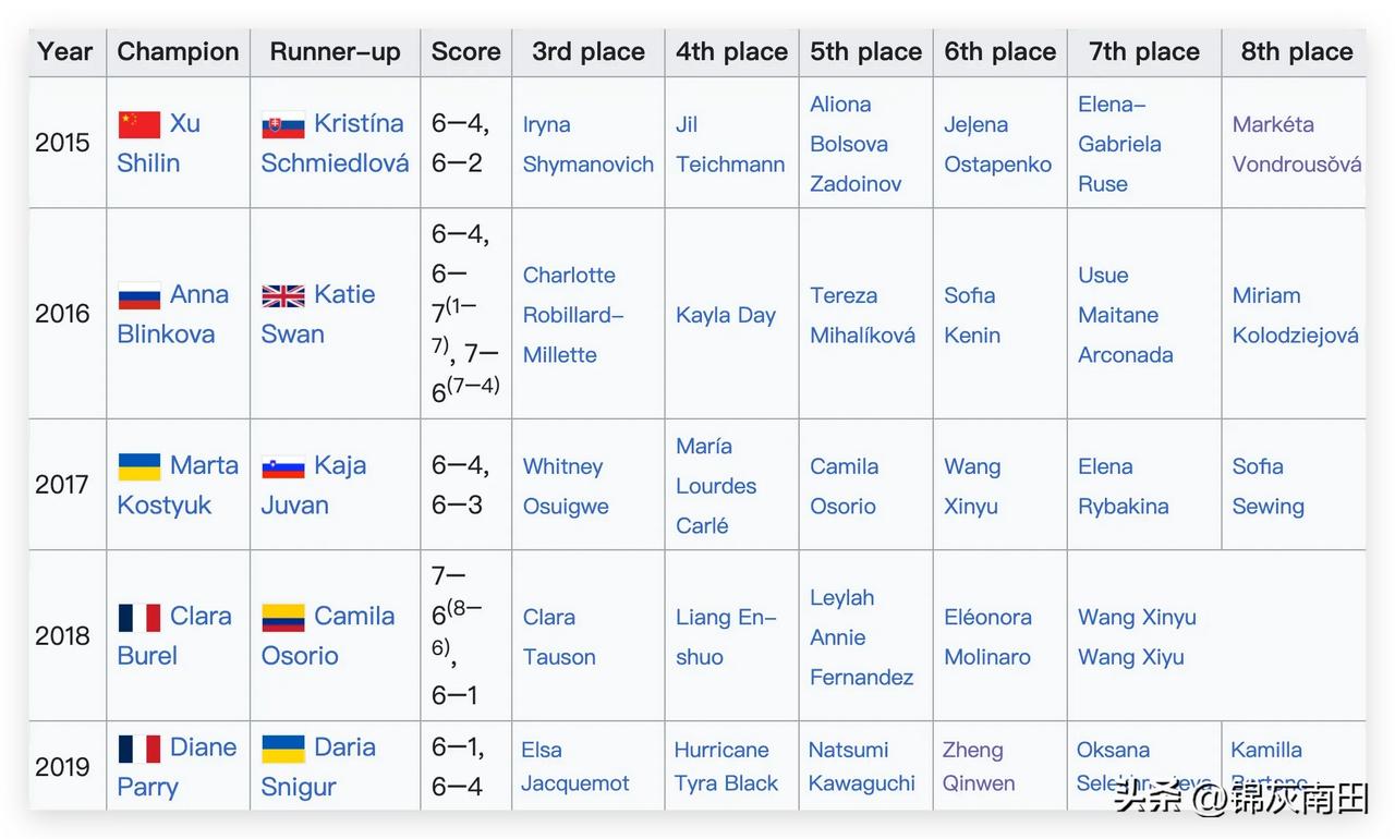 再看19年在成都举办的ITF青少年年终总决赛,就是郑钦文那个经典民国女学生造型的那一场比赛[大金牙]。 那一年男单冠军是丹麦选手鲁内,他也是最先打出来了。今年可以参加六王赛,和德约科维奇、纳达尔、辛纳、阿尔卡拉斯同台竞技。男子中还有穆塞蒂,布云朝克特也冒出头了。女单冠军是法国选手帕里,郑钦文是当年的第六名,她是这一届女单中现在打得最好的。帕里最高的排名是61名。 再过5年后重新回首,不知道会出几位巨星。