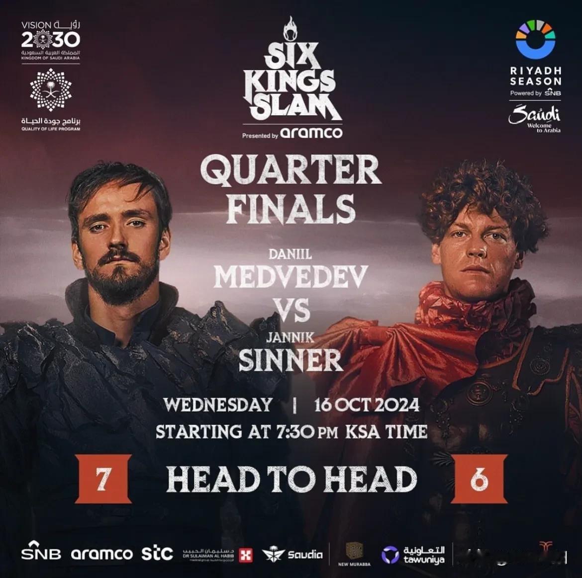 #2024利雅得六王赛今日开打。 赛事安排是16号辛纳VS梅德韦杰夫,胜者对决德约科维奇 17号阿尔卡拉斯VS鲁内,胜者挑战纳达尔 两组的胜出者进入决赛角逐冠军 这是最顶级的选手强强对决,精彩程度不难想象。让该赛事备受关注。对于参赛的球员来说,他们每人的出场费用为150万美元,冠军奖金600万美元。这一高额出场费和丰厚的冠军奖金,绝对是值回票的一趟旅程。皆大欢喜[大金牙]
