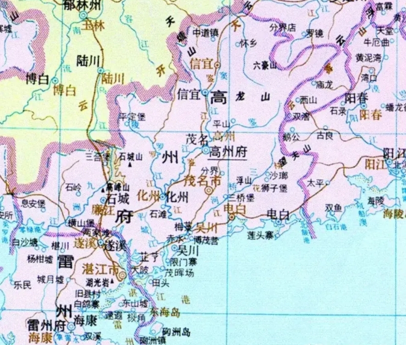 清代的雷州府现称为湛江市,下辖遂溪、海康以及徐闻县,府治也不在今天的雷州市,而搬到了今天的湛江市区一带。此外,今天湛江下辖的吴川市在清朝同廉江市一道为高州府所管辖。高州府的府称与其附郭的名称则直接换了一道:当时的高州府下辖茂名县,且茂名县为高州府附郭,而今天的茂名市则下辖高州市(县级市),只是当时的高州府治从今茂名高州市迁至今茂名市区。而除了后来被划分给湛江的廉江和吴川市、作为附郭的茂名县,清代高州府仍下辖信宜、化州、电白等县,这些依然是今天茂名市所下辖的县级单位。