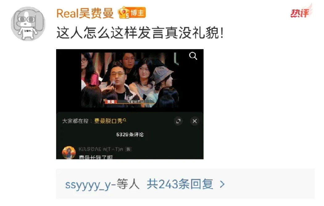 突然就很心疼吴费曼,他在节目里就只是露了一个脸而已,就被一些网友追着骂长残了,太丑了一类不中听的话,对此吴费曼十分不高兴的将网友骂他的话截图发了出来,并说:“这个很怎么这样发言?真没礼貌!”
