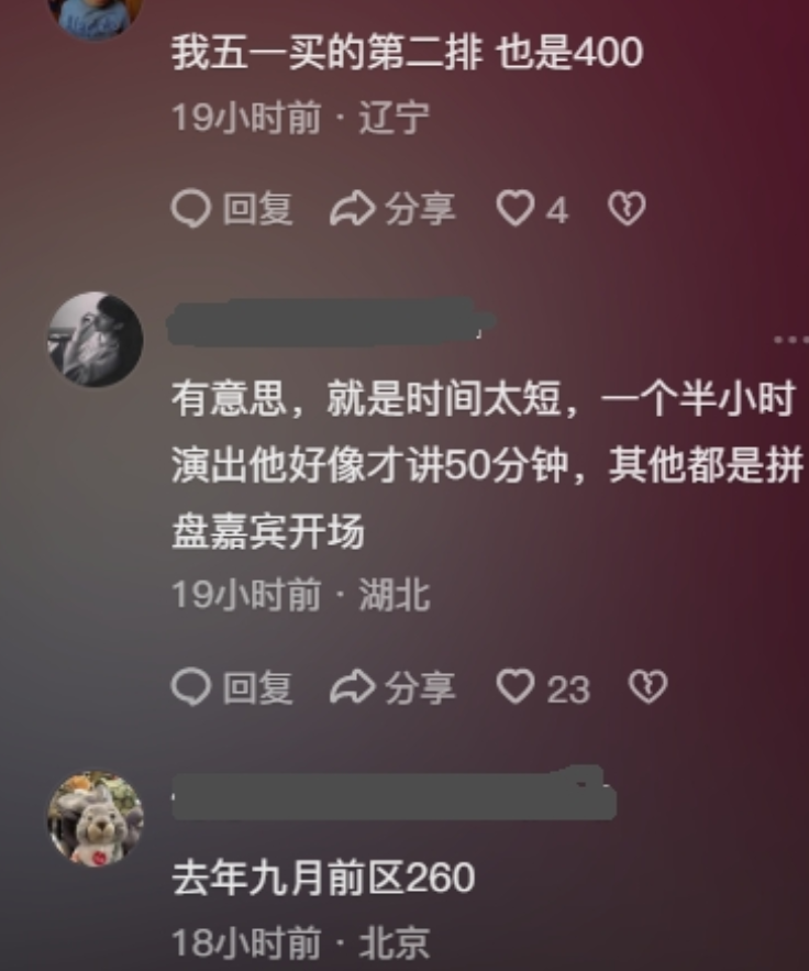 买了高价票的粉丝爆料:付航现在一场演出大约90分钟,但他表演的时长只有50分钟,其余40分钟交给了其他脱口秀演员。